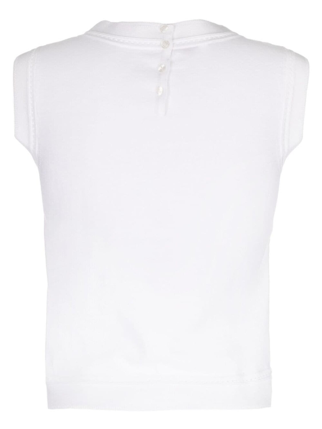 Белый, хлопок, вставки из кружева, круглый вырез, застежка на пуговицы сзади, без рукавов и прямой подол.