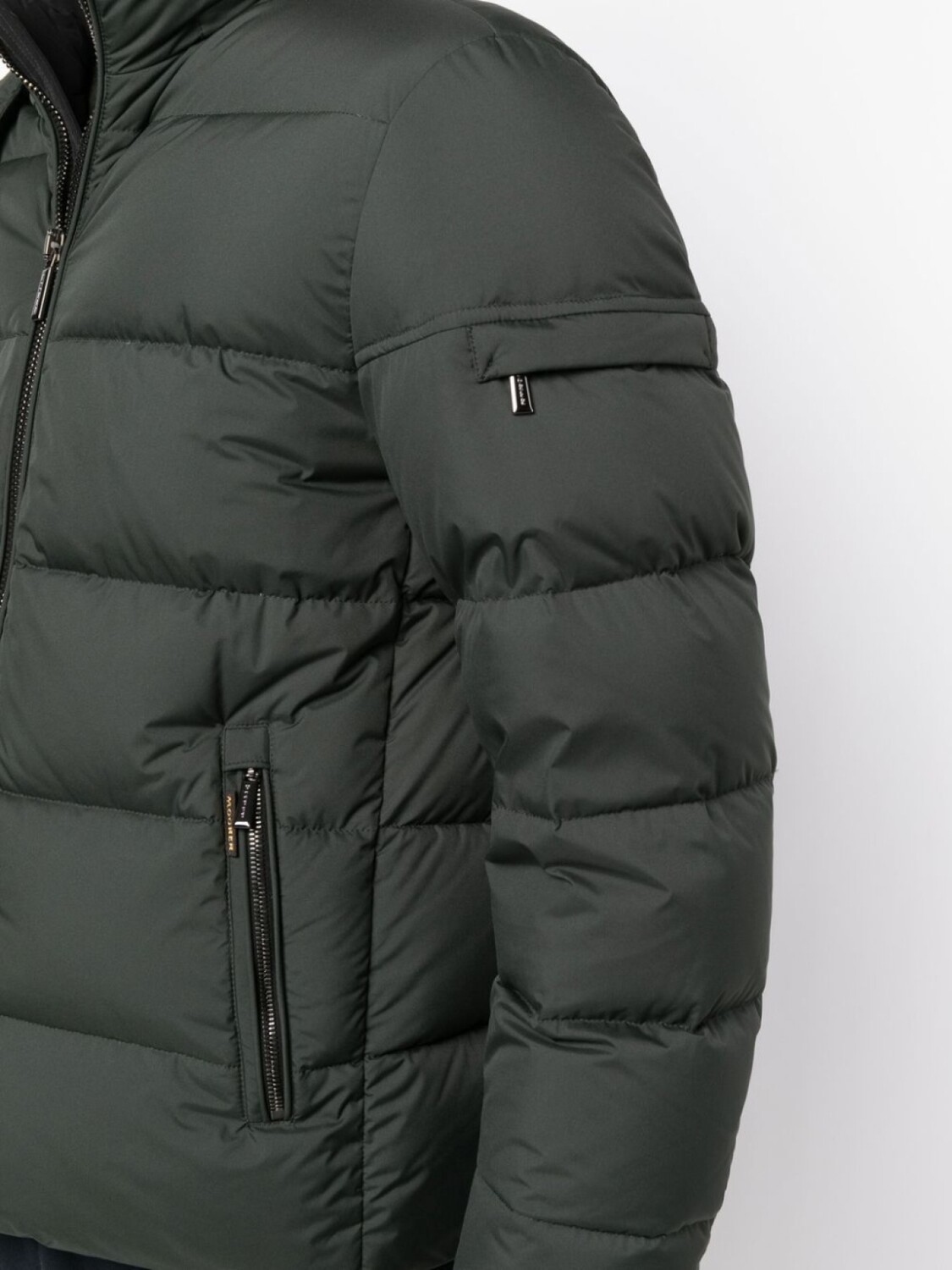 Дутый материал, два кармана на молнии по бокам, застежка на молнии спереди, классический капюшон, длинные рукава и прямой подол.