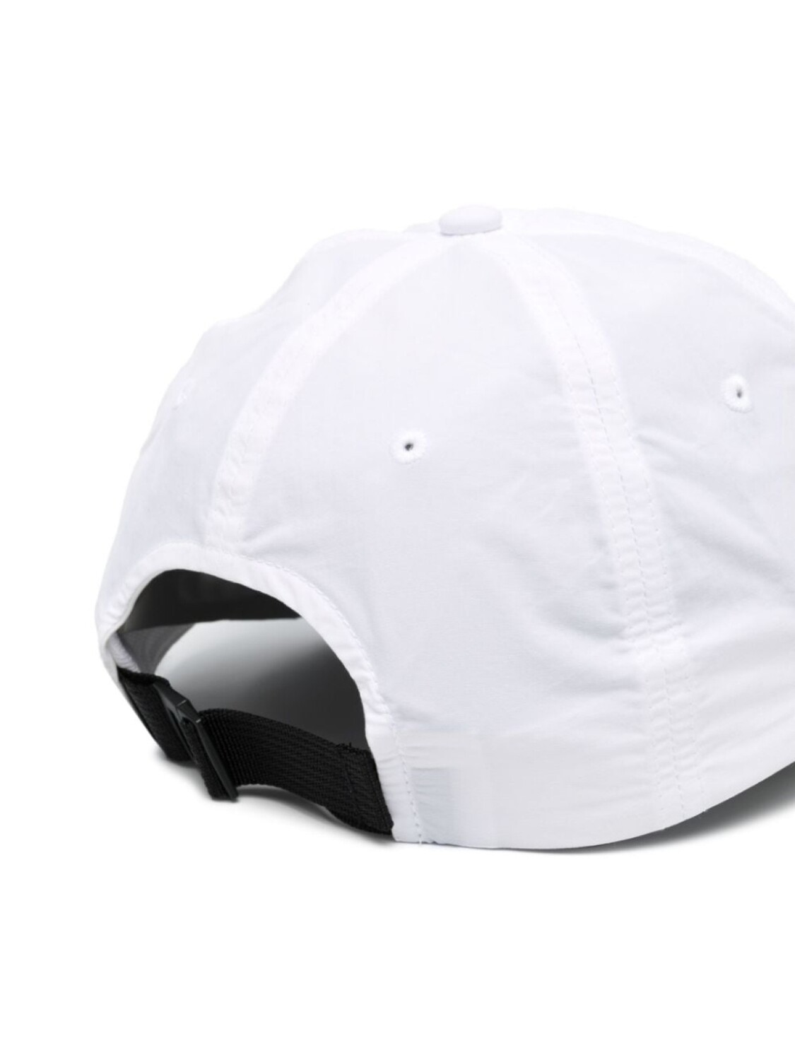 Белый, вышитый логотип спереди, закругленный козырек, пять панелей, обтянутая тканью пуговица на тулье и регулируемый ремешок сзади.