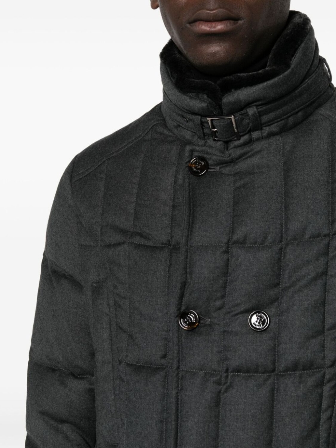 Антрацитово-серый, смесовая необработанная шерсть, дутый материал, воротник-труба, длинные рукава, манжеты с ремешками, двубортная застежка на кнопки, два передних кармана с клапанами, два нагрудных кармана с листочкой и прямой подол.