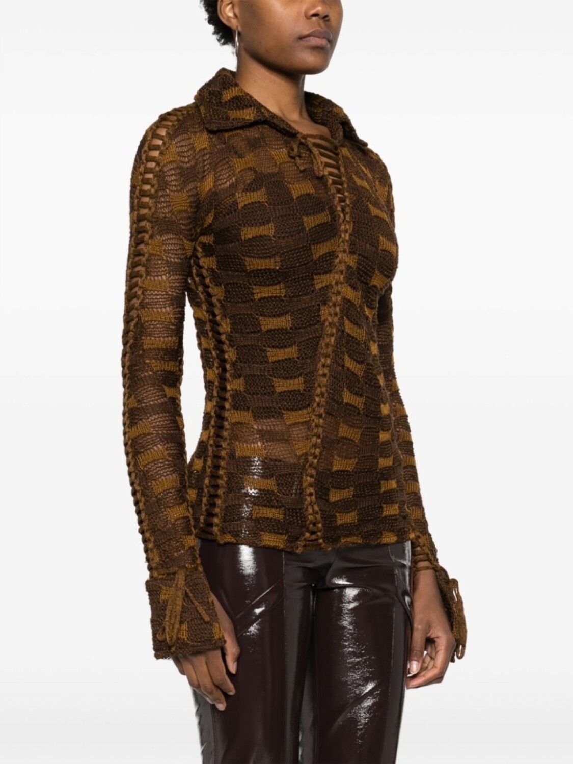 Кофейный, коньячный коричневый, трикотажный материал, ажурная вязка, отложной воротник, завязки спереди, длинные рукава и прямой подол.