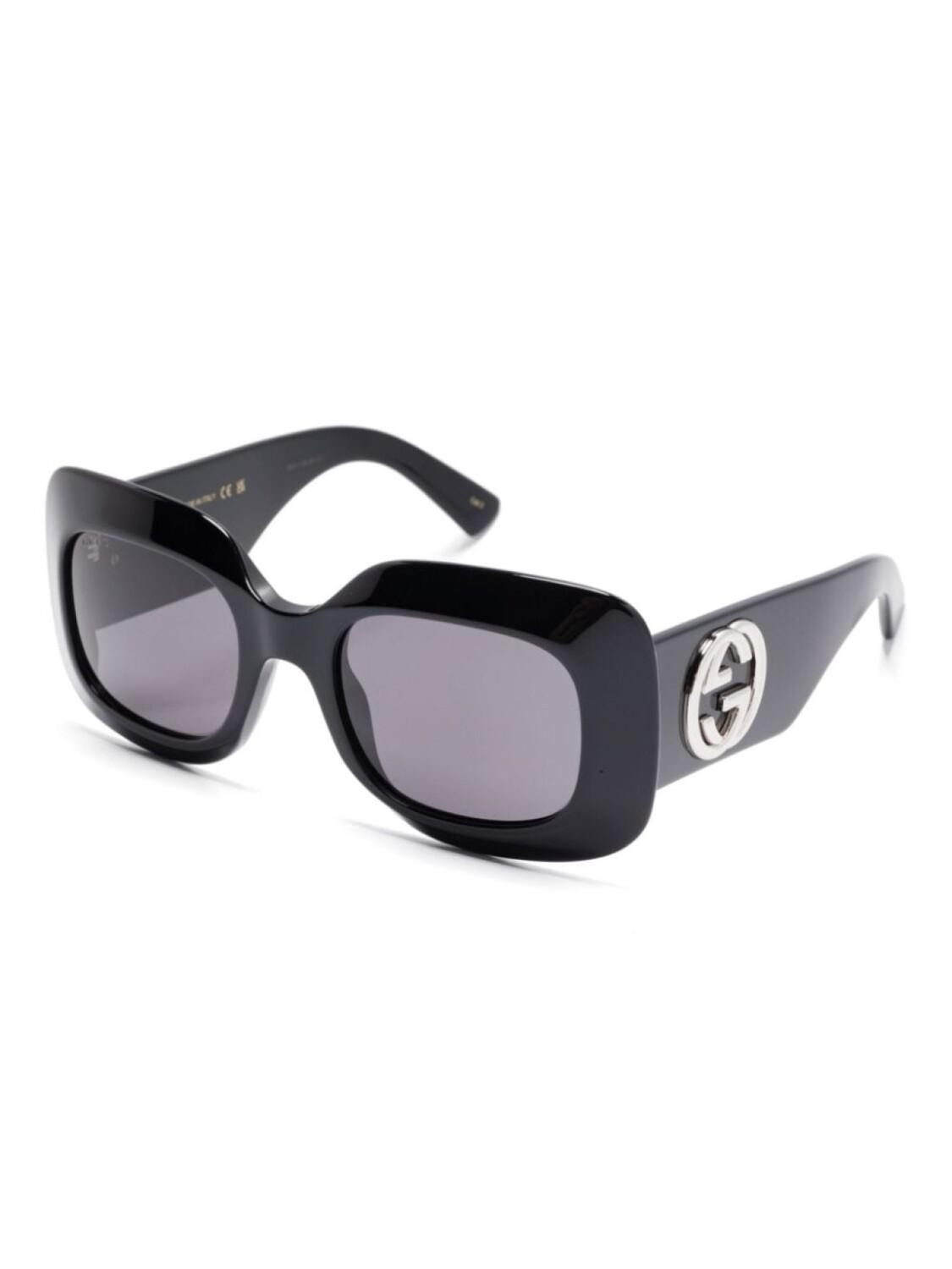 Черная блестящая отделка, большая оправа, тонированные линзы, линзы с защитой от УФ-излучения, наклейка на линзе, логотип в виде переплетенной буквы G, большие дужки, изогнутые кончики. Эти очки поставляются с защитным футляром.