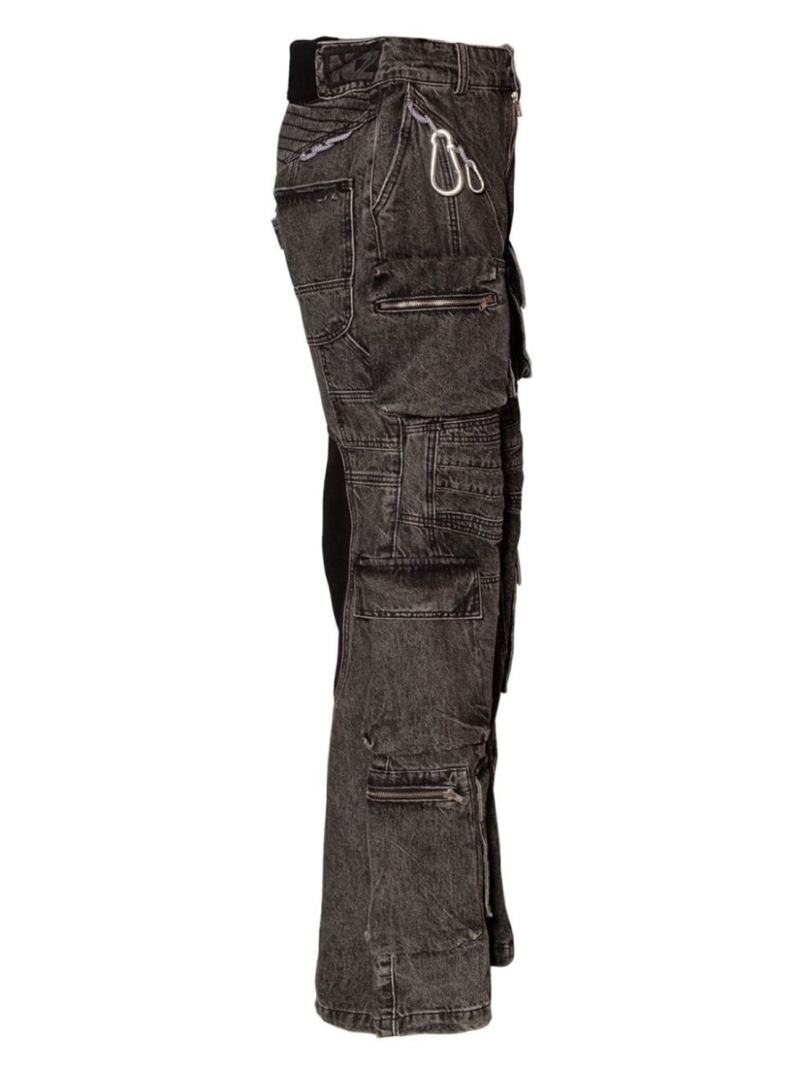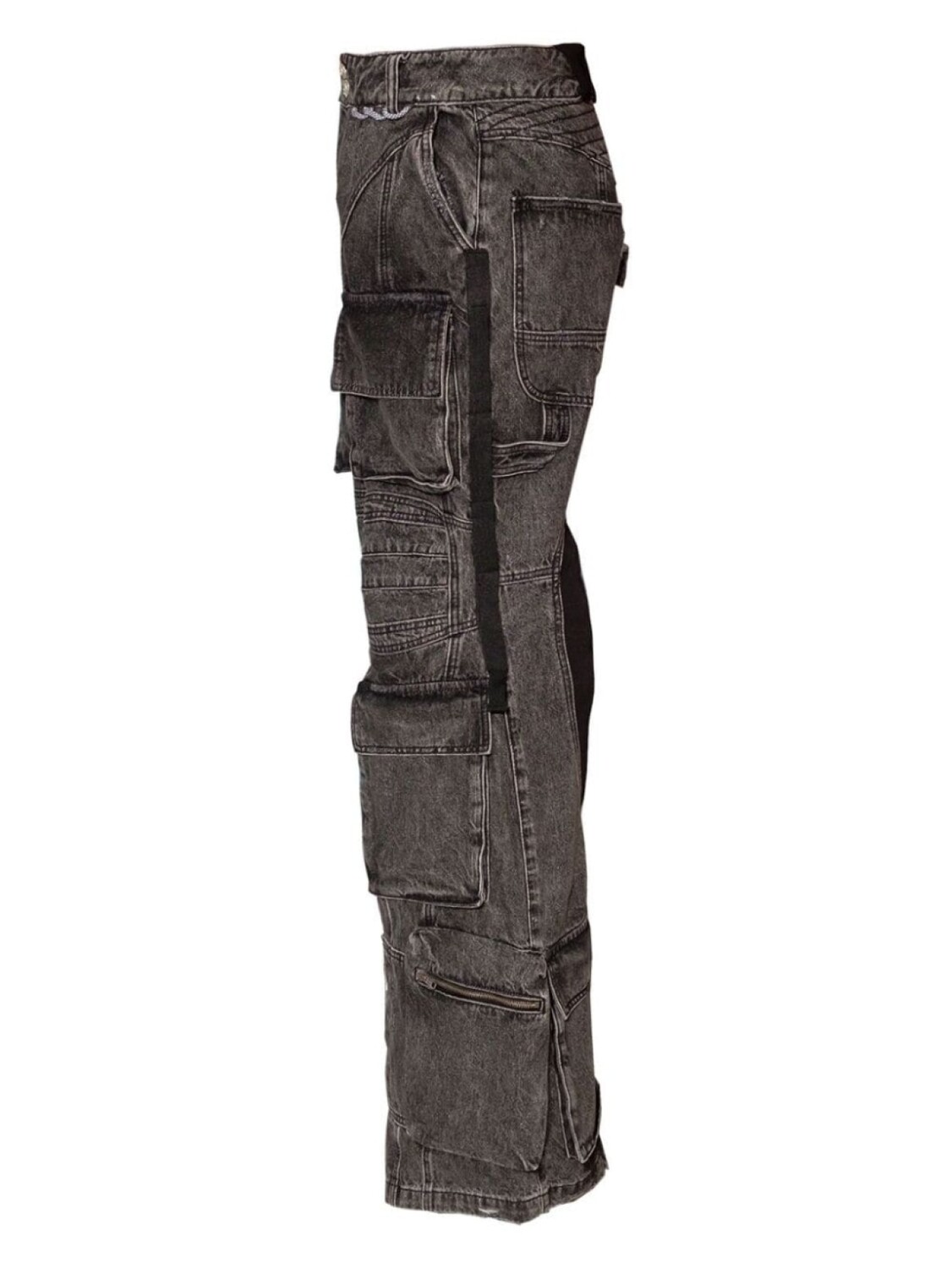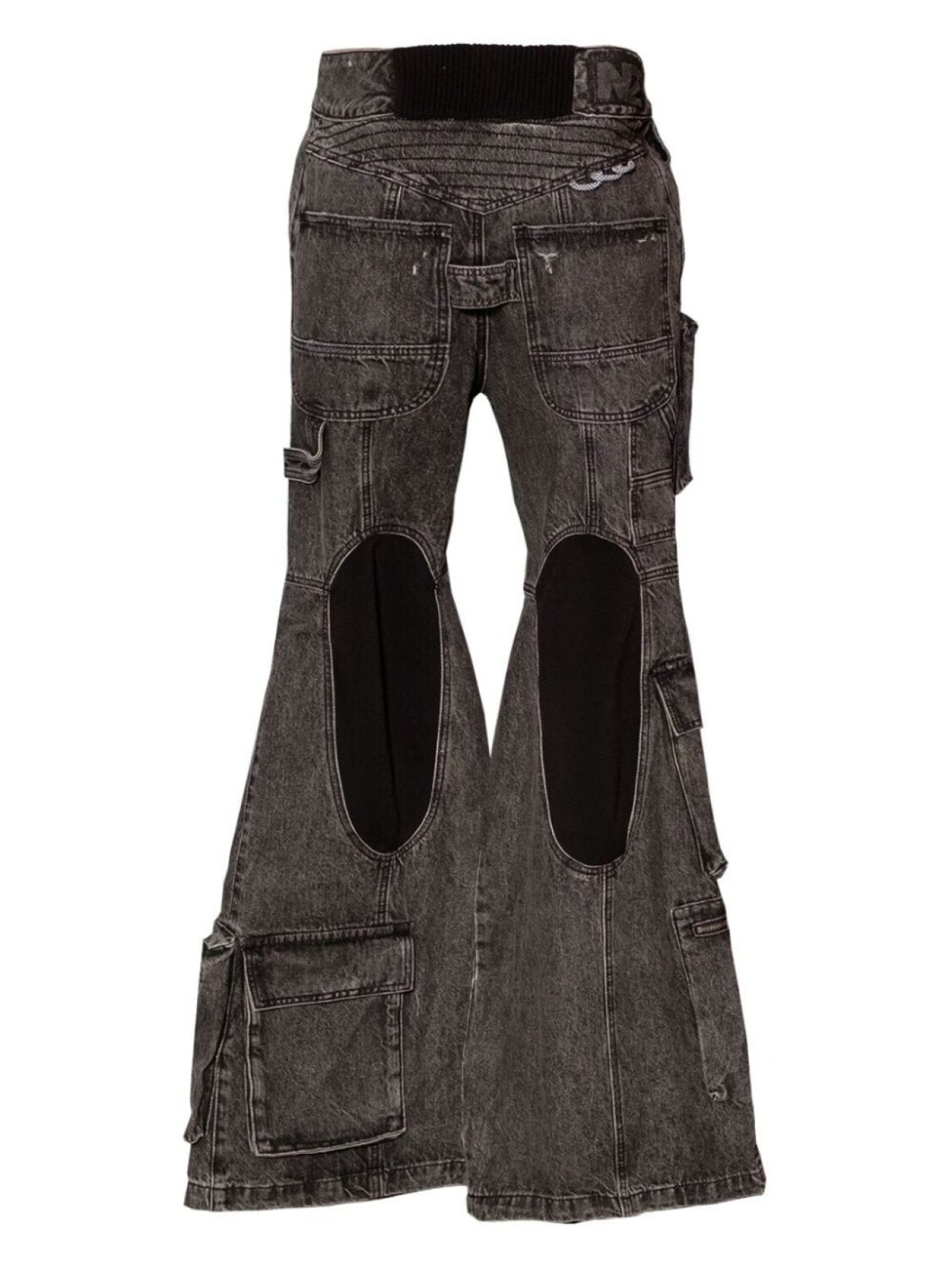 Черный хлопковый деним темного цвета со средней посадкой, шлевки для ремня, несколько карманов-карго, застежка на пуговицы спереди, расклешенный