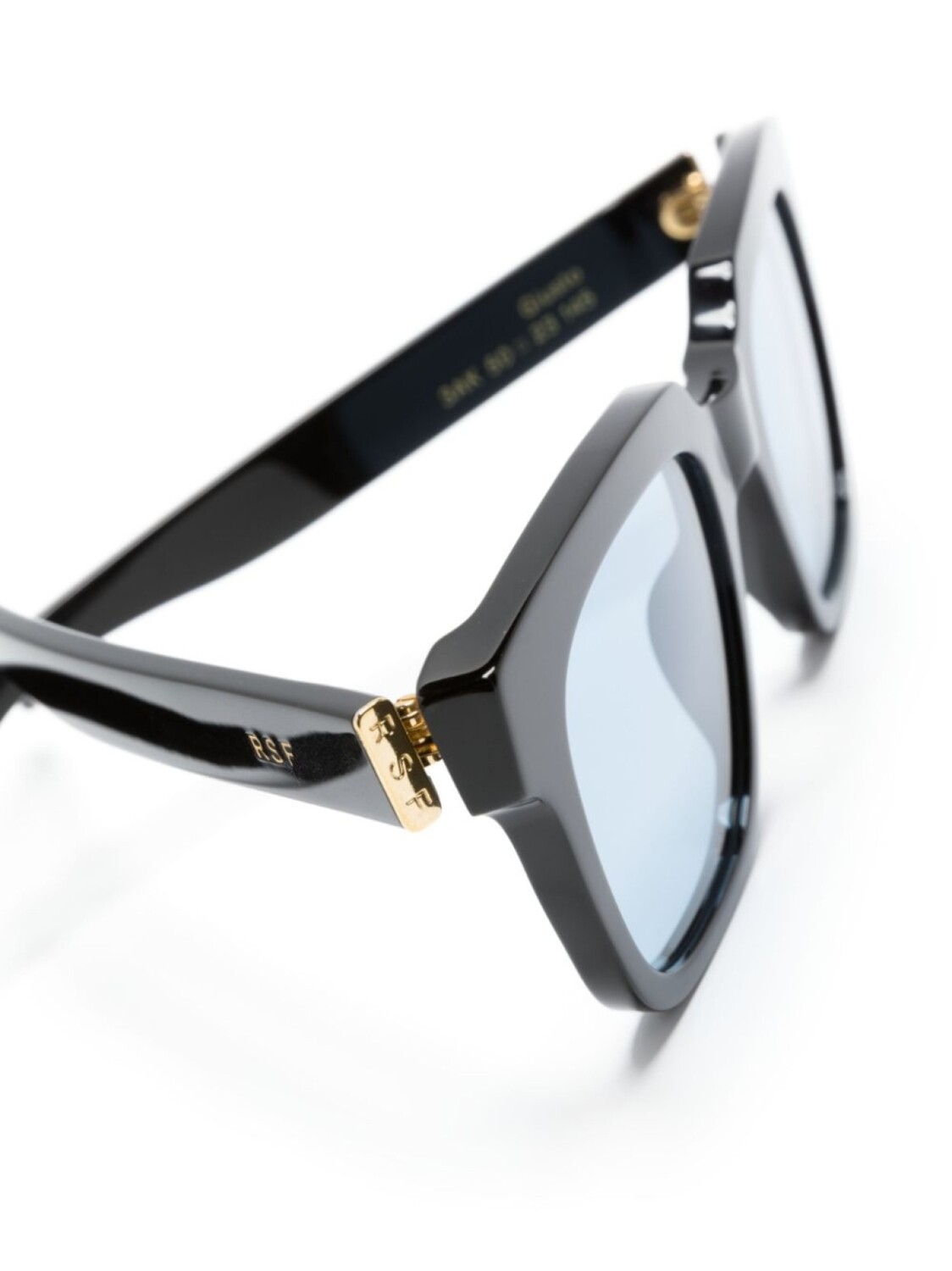 Черный, ацетат, золотистая фурнитура, квадратная оправа, синие линзы, логотип на дужке, прямые дужки и дужки с закругленными концами. В комплект входит защитный чехол для очков.