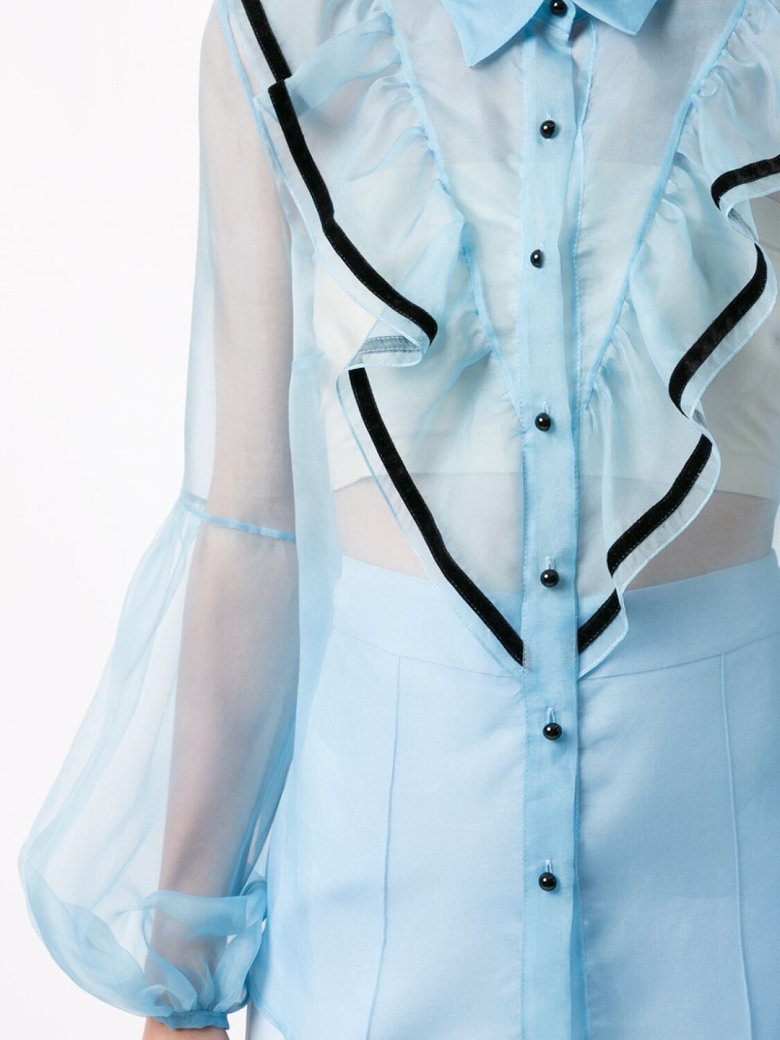 Блузка Love Bird от McGraw (МакГроу). Прозрачная деталь, классический воротник, контрастная окантовка, застежка на пуговицах спереди, оборочная отделка, панельные длинные рукава и закругленный подол. Цвет: синий.
