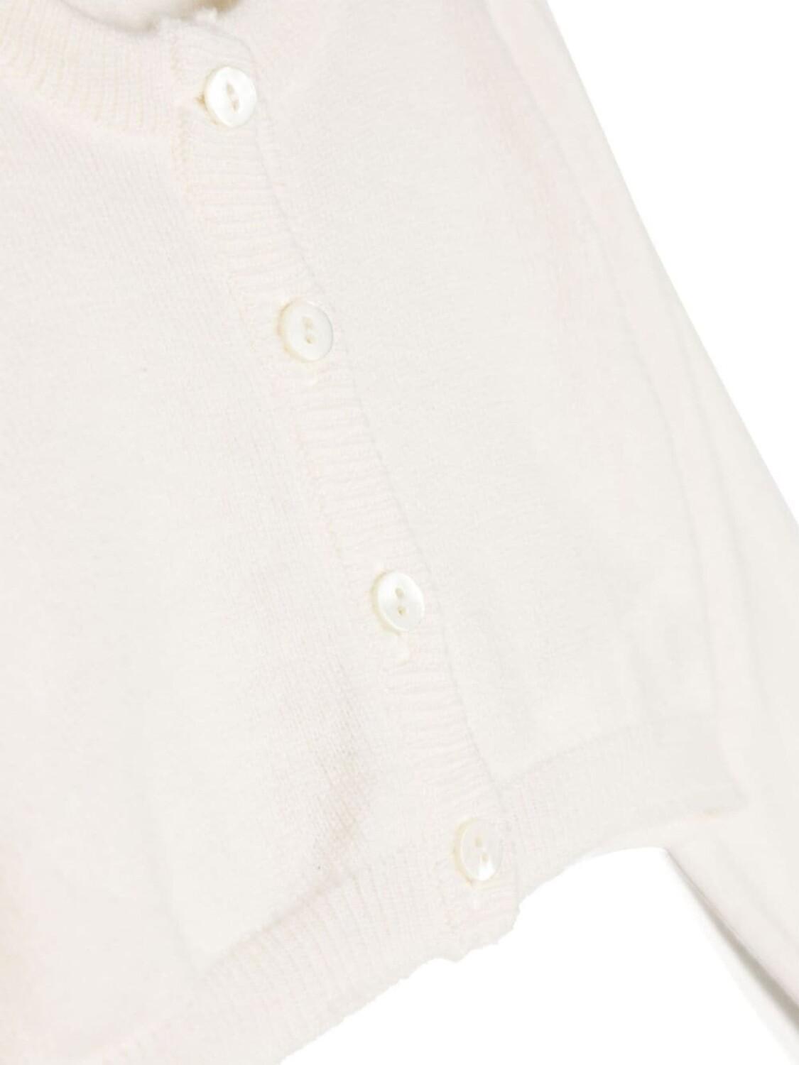 Цвет слоновой кости, кашемир, крупная вязка, круглый вырез, застежка на пуговицах спереди и длинные рукава.