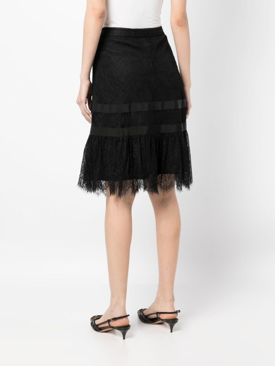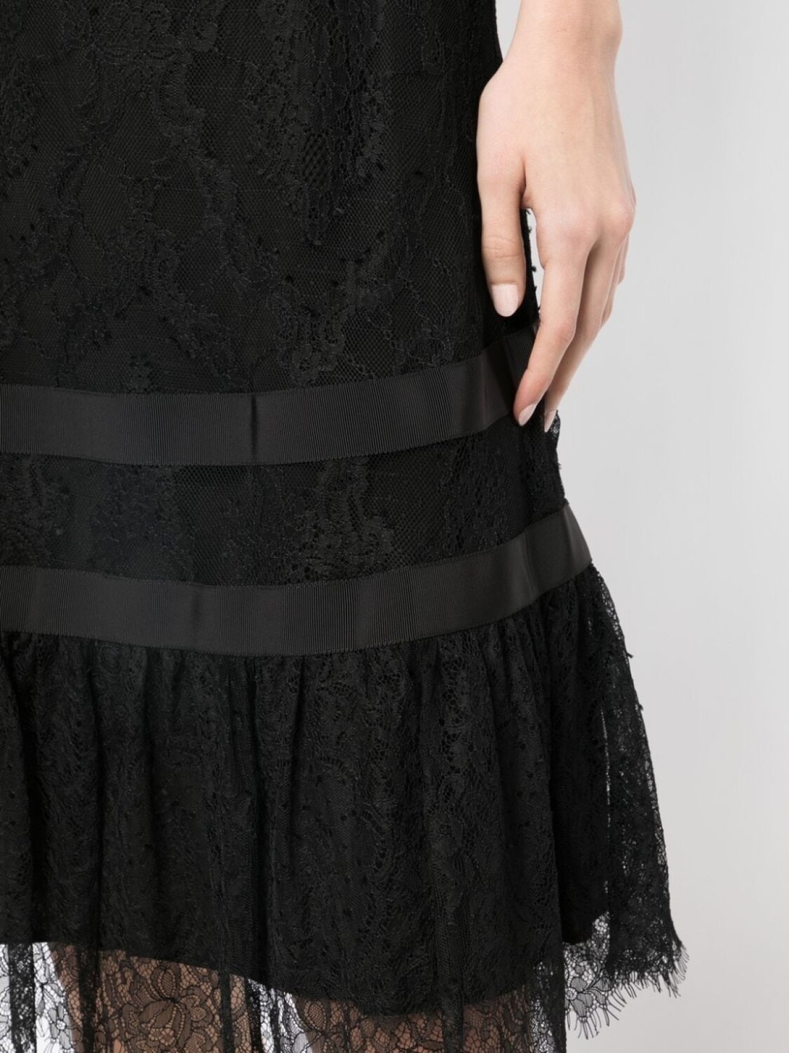 Черный, вставки из цветочного кружева, подол с фестонами, А-образный силуэт и длина миди.