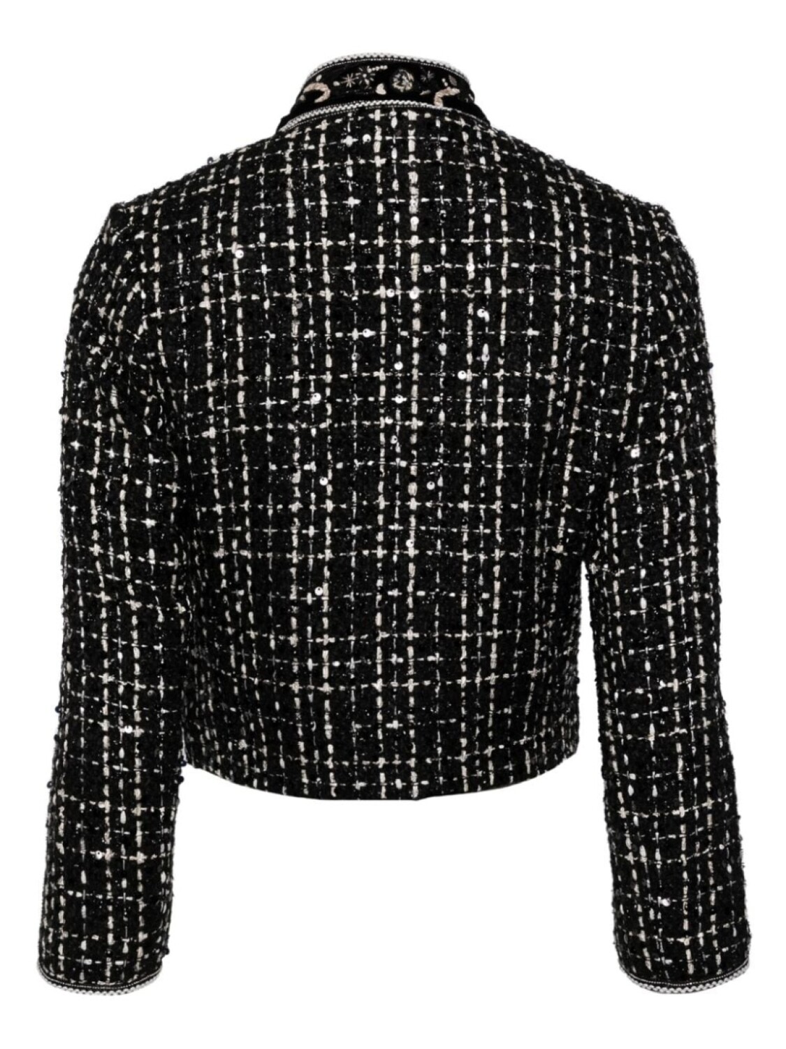 Черный/белый, застежка на кнопках спереди, вышивка, твидовая ткань, плетеный узор, пайетки, два передних кармана с клапанами, длинные рукава, цельная подкладка