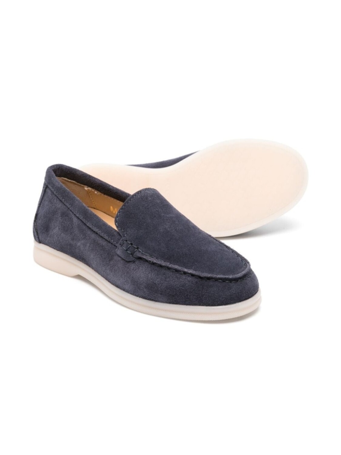 Темно-синий, замша из телячьей кожи, швы, закругленный носок, модель без застежки, кожаная стелька с логотипом и массивная резиновая подошва.