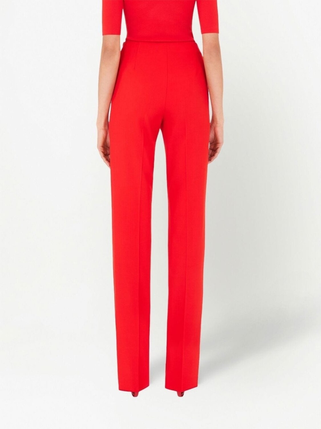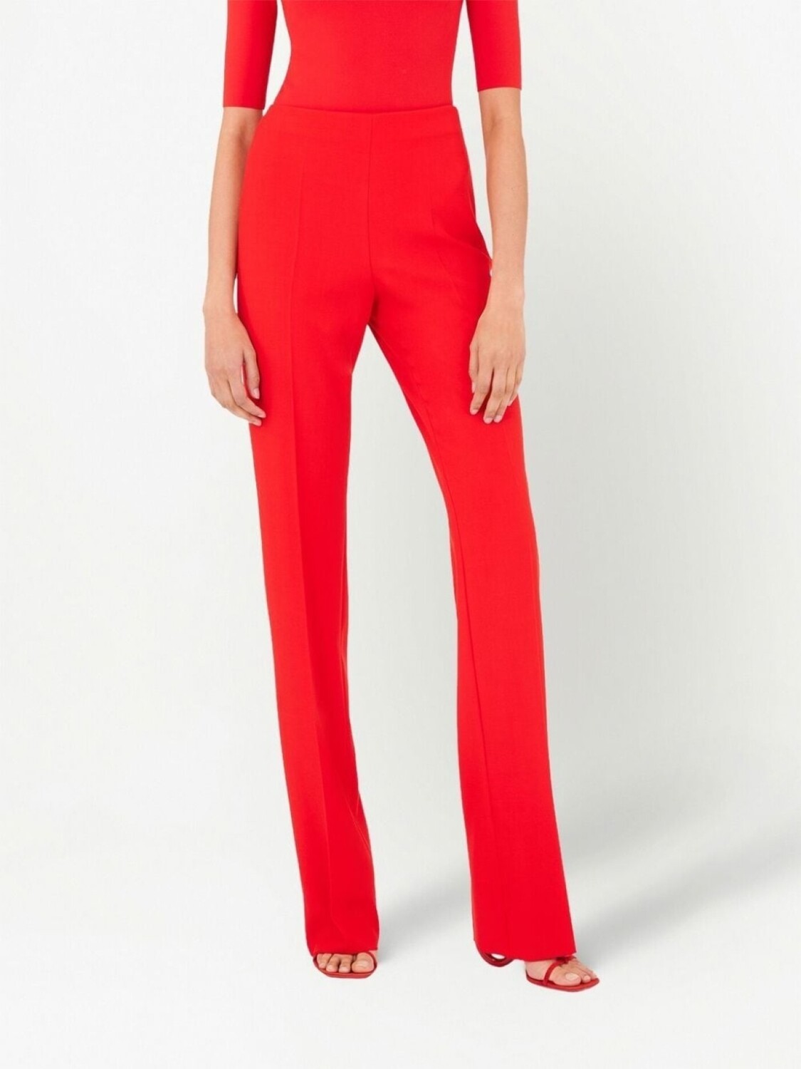 Ярко-красный, необработанная шерсть, хлопок, стрелки, завышенная талия и прямой крой.