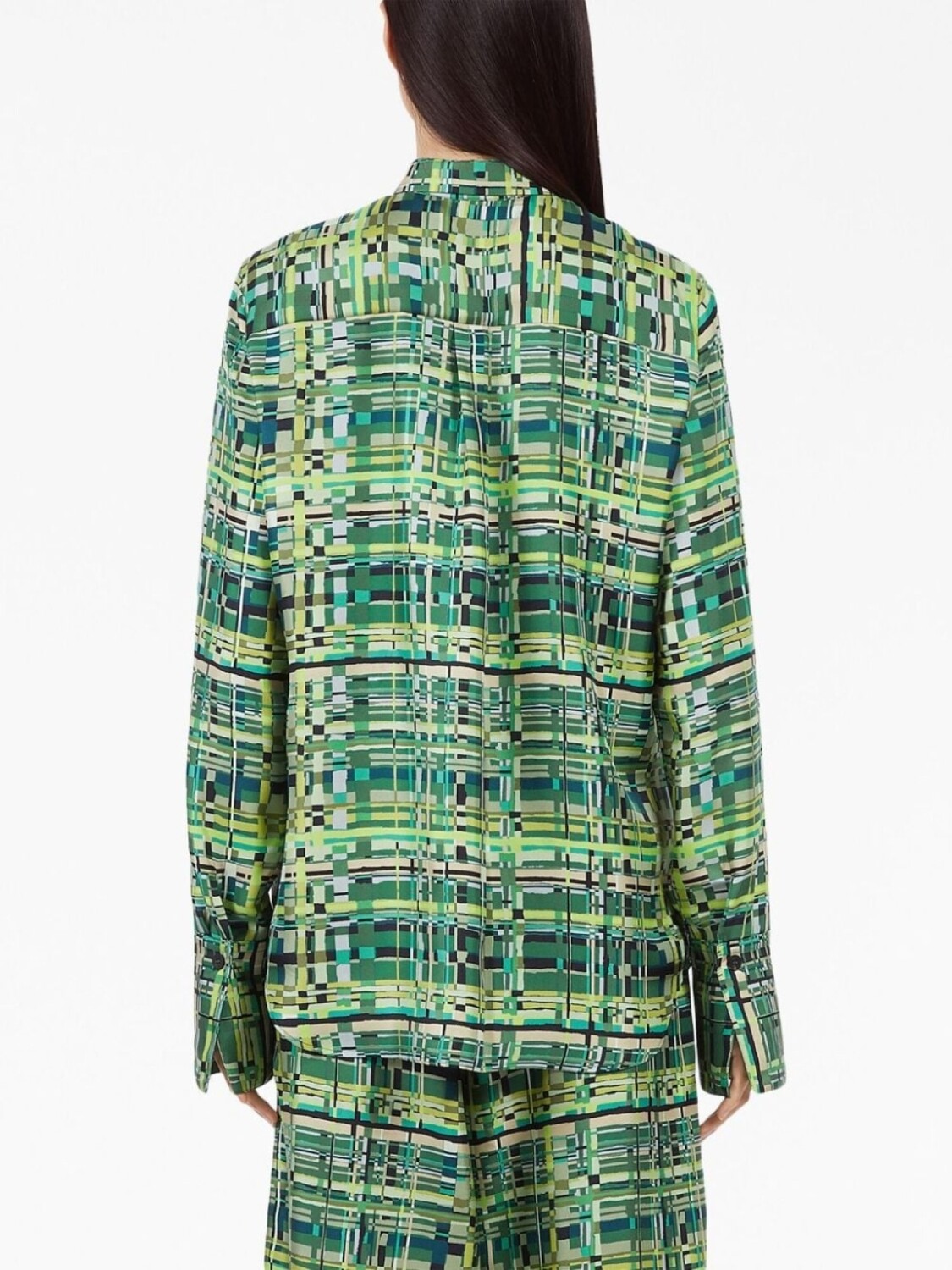 Салатовый, разноцветный, шелк малбери, принт в клетку, классический воротник, застежка на пуговицах спереди, удлиненные рукава и закругленный подол сзади.