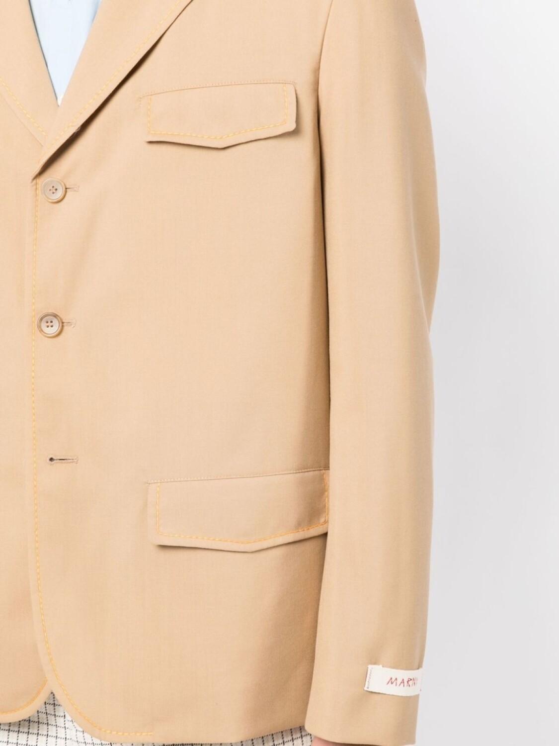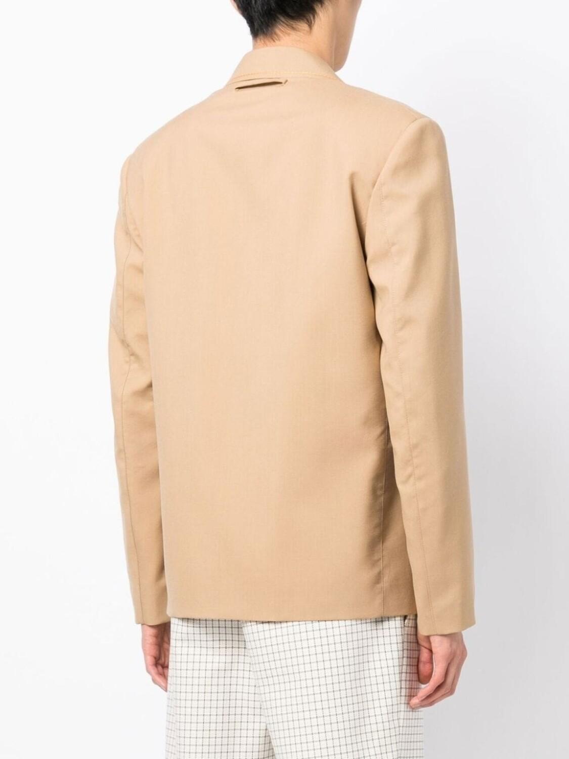 Расцветка Light Brown, шерсть, зазубренные лацканы, застежка на пуговицах спереди, прорезной карман на груди, два передних кармана с клапанами и длинные рукава.