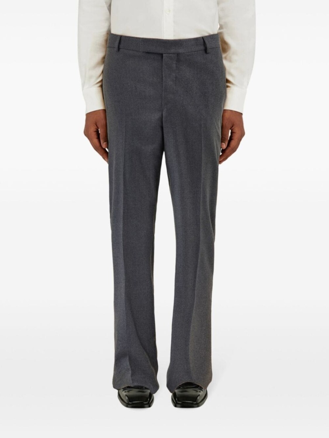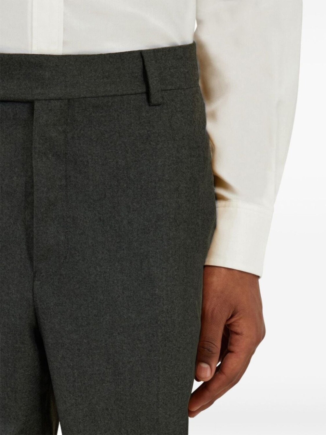 Антрацитово-серый цвет натуральной шерсти меланжевый эффект потайная застежка на пуговицы средняя посадка шлевки для ремня заутюженная складка два прорезных кармана по бокам два прорезных кармана сзади приталенный крой удлиненная длина