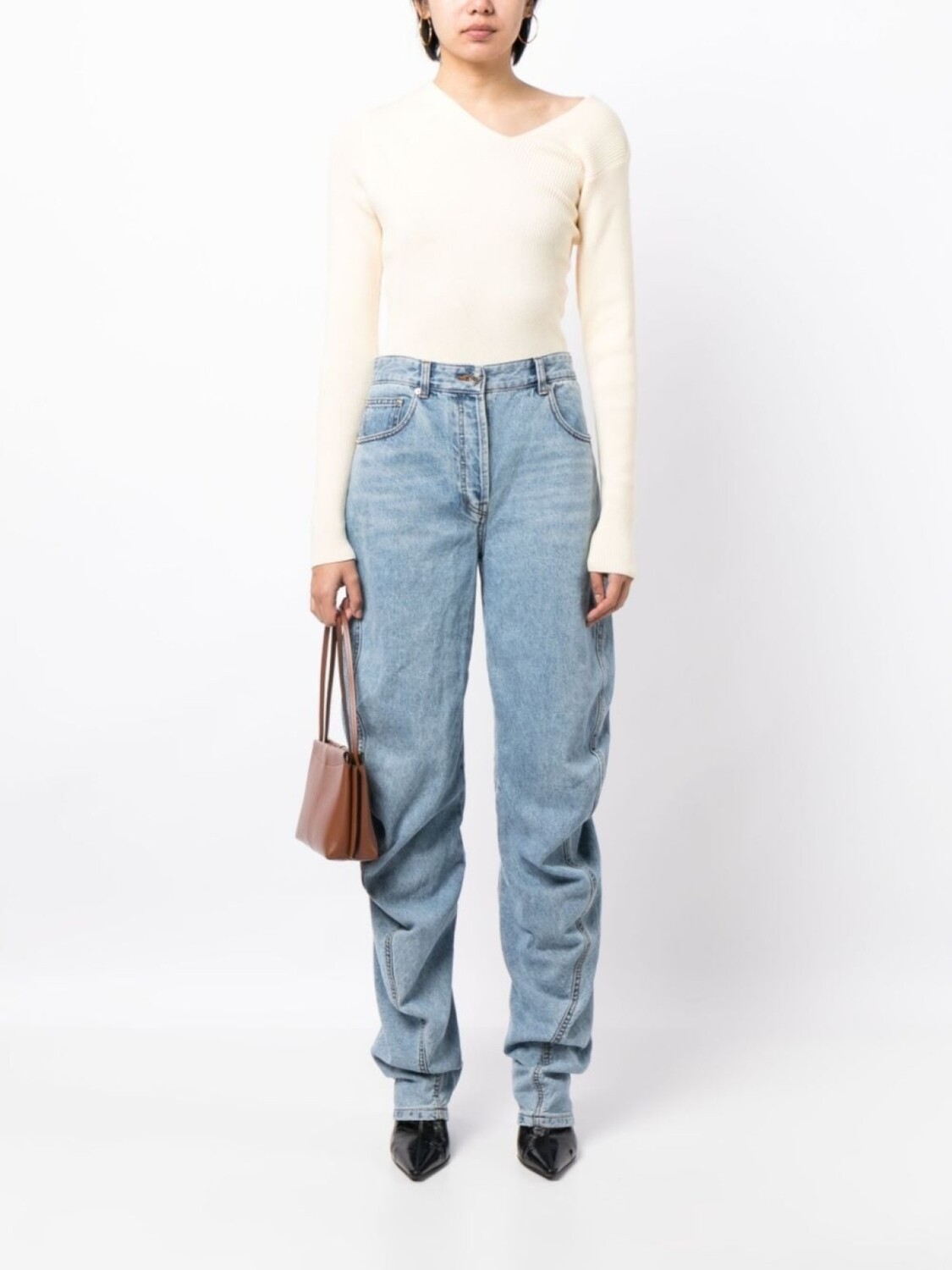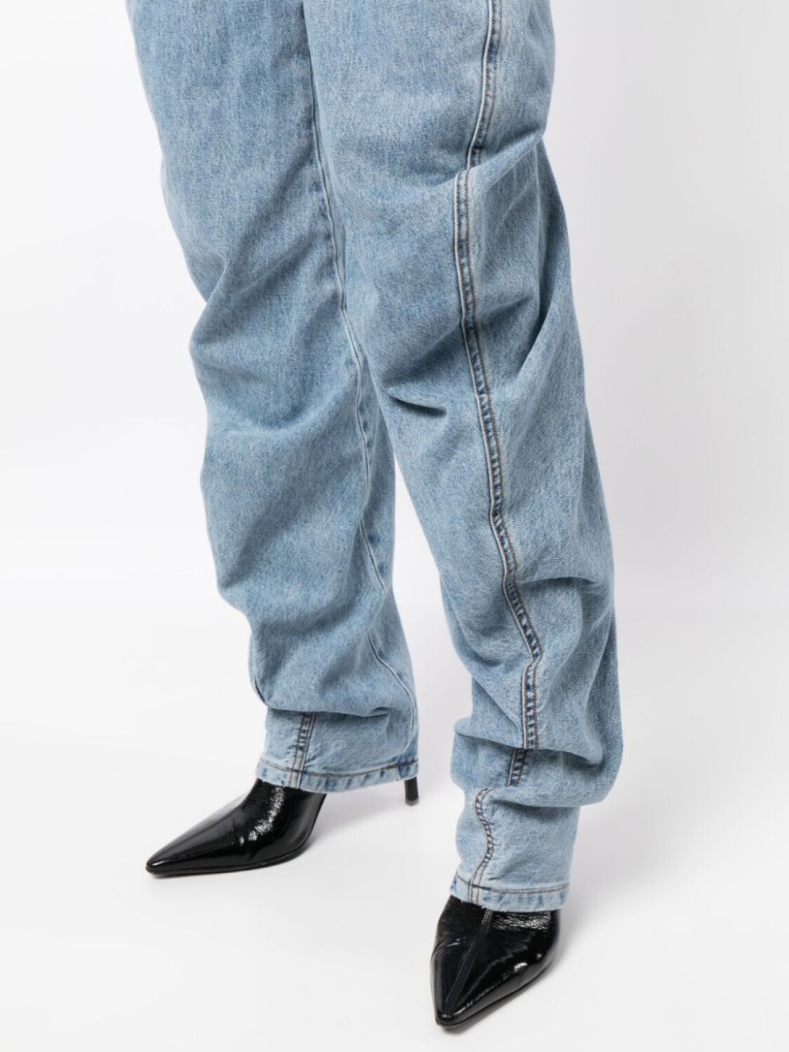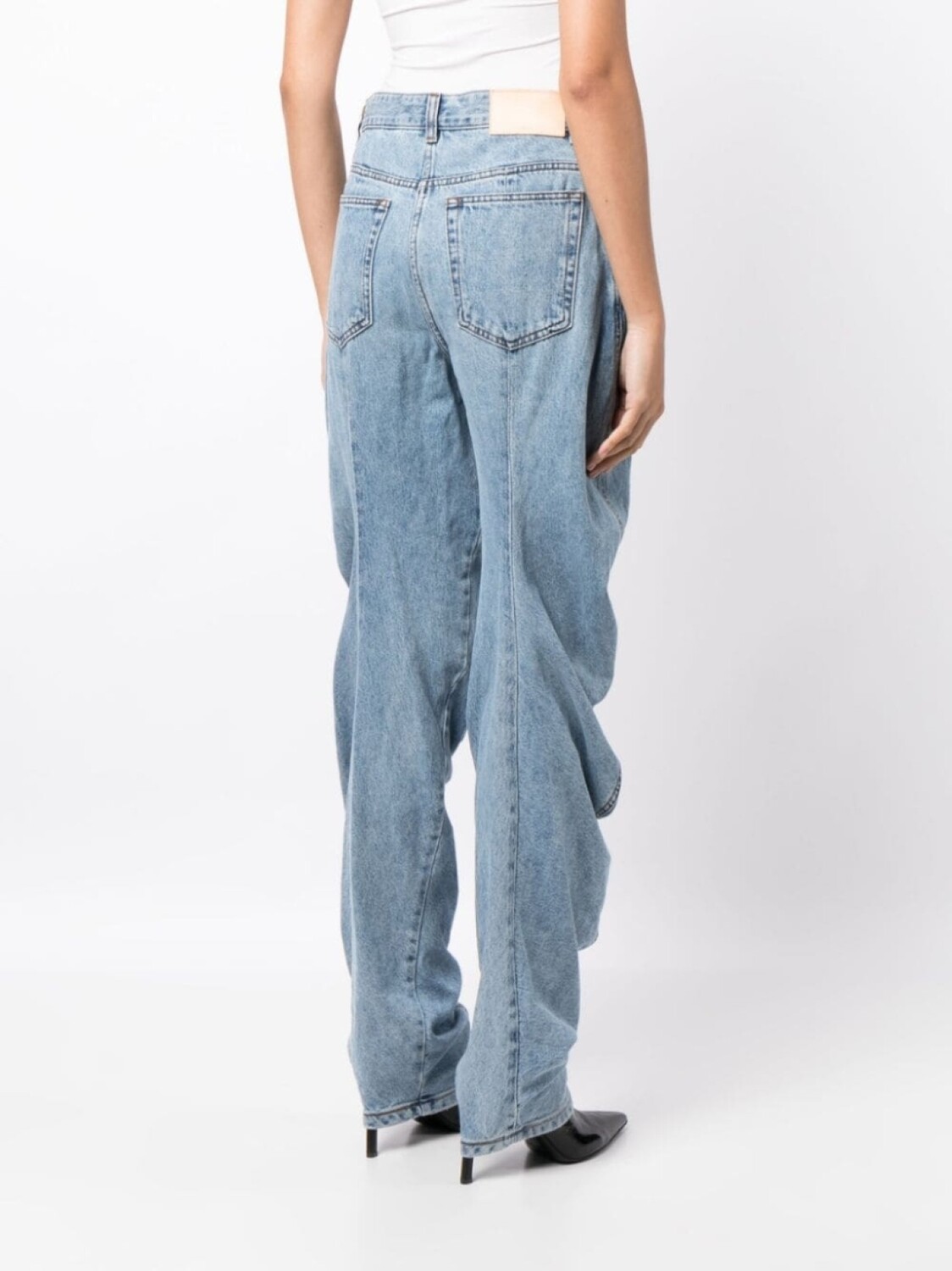 Голубой, хлопок, нашивка с логотипом сзади, петли для ремня, потайная застежка на молнии и пуговицах, пять карманов и расклешенный крой.
