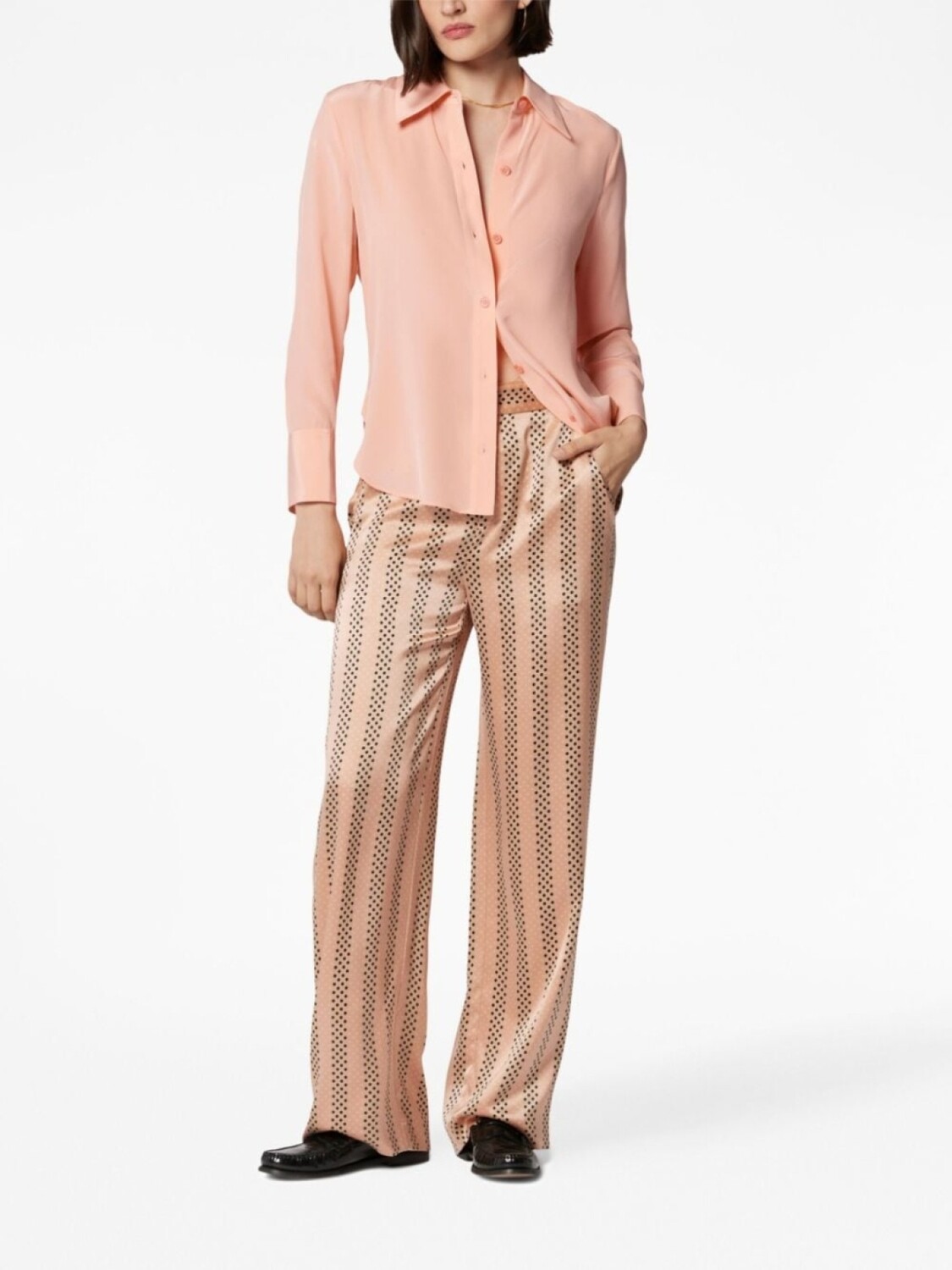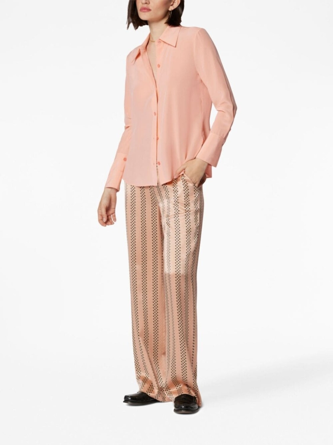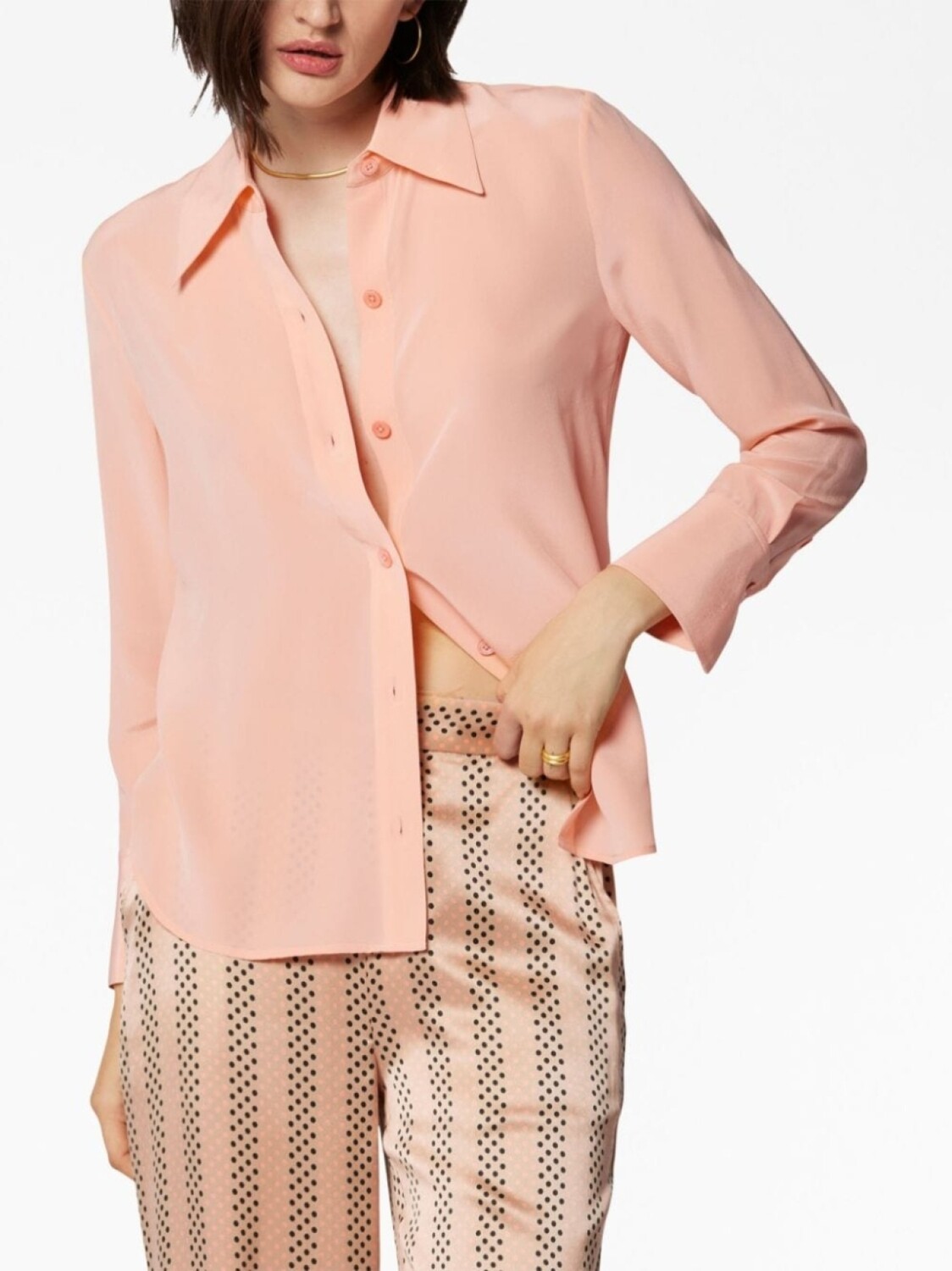 Кораллово-розовый, шелк, плоский заостренный воротник, застежка на пуговицах спереди, рукава с манжетами на пуговицах и закругленный подол.