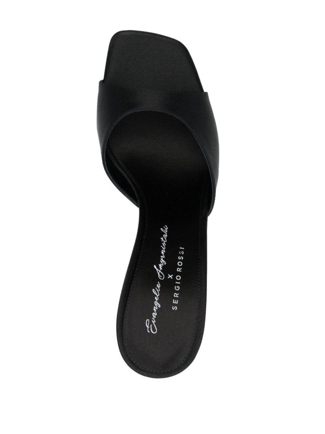 Черный, шелковый атлас, модель без застежки, открытая спина, открытый носок, квадратный носок, скульптурный каблук, стелька с логотипом и кожаная подошва.