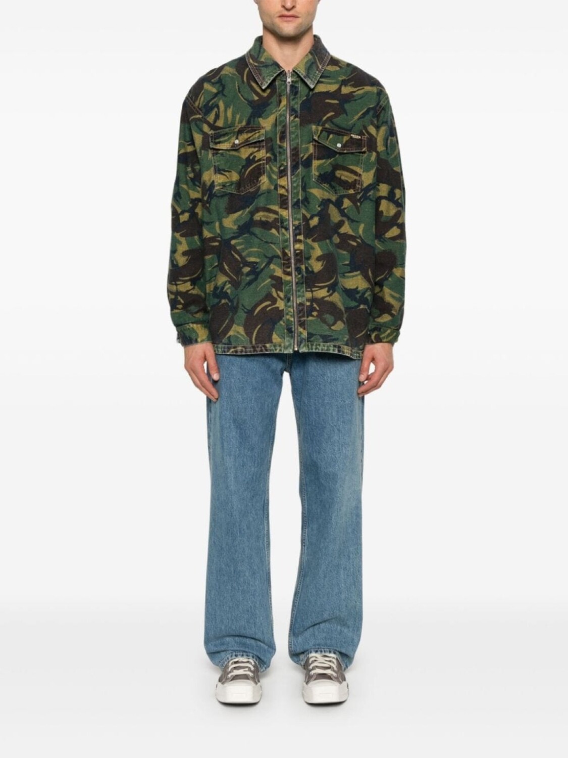 Сторона A:, синий, хлопок, деним, эффект потертости, застежка на молнии спереди, классический воротник, длинные рукава, манжеты с застежкой на кнопки, нагрудный накладной карман, зеленый/коричневый, хлопок, деним, камуфляжный принт, застежка на молнии спереди, классический воротник, длинные рукава, манжеты с застежкой на кнопки, два нагрудных кармана с клапанами, прямой подол
