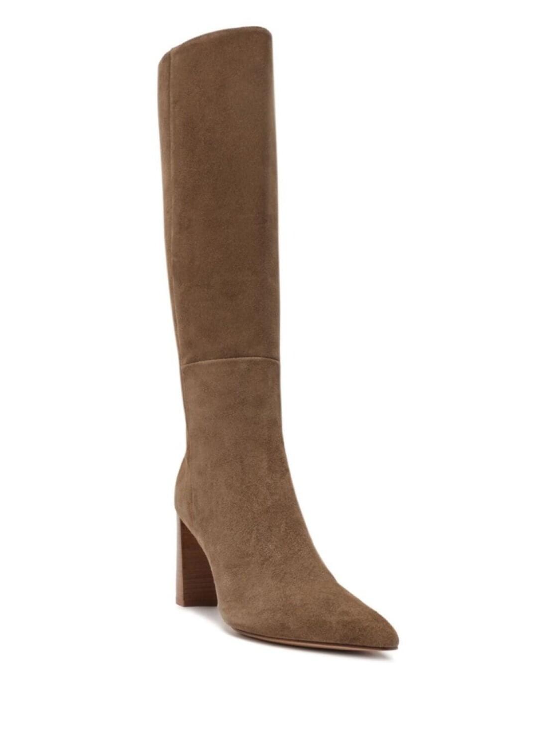 Коньячный коричневый, замша, длина по колено, застежка на молнии сбоку, заостренный носок, кожаная подошва и блочный каблук.