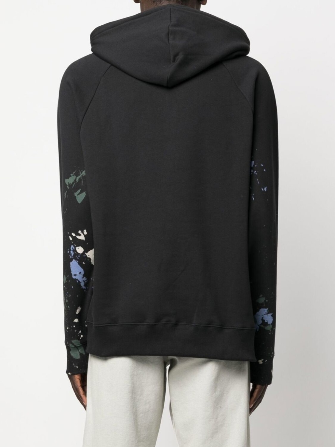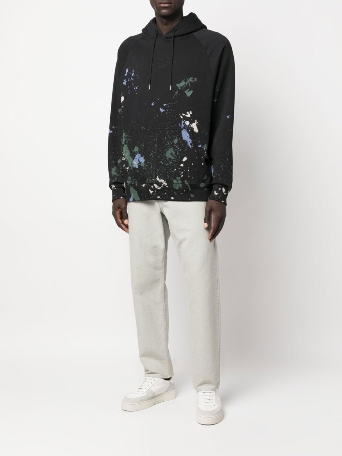 Угольно-серый, оливковый, нежно-голубой, кремовый, органический хлопок, эффект разбрызганной краски, вышитый логотип на груди, затягивающийся на шнурок капюшон, длинные рукава, манжеты в рубчик, карман-муфта и подол в рубчик.