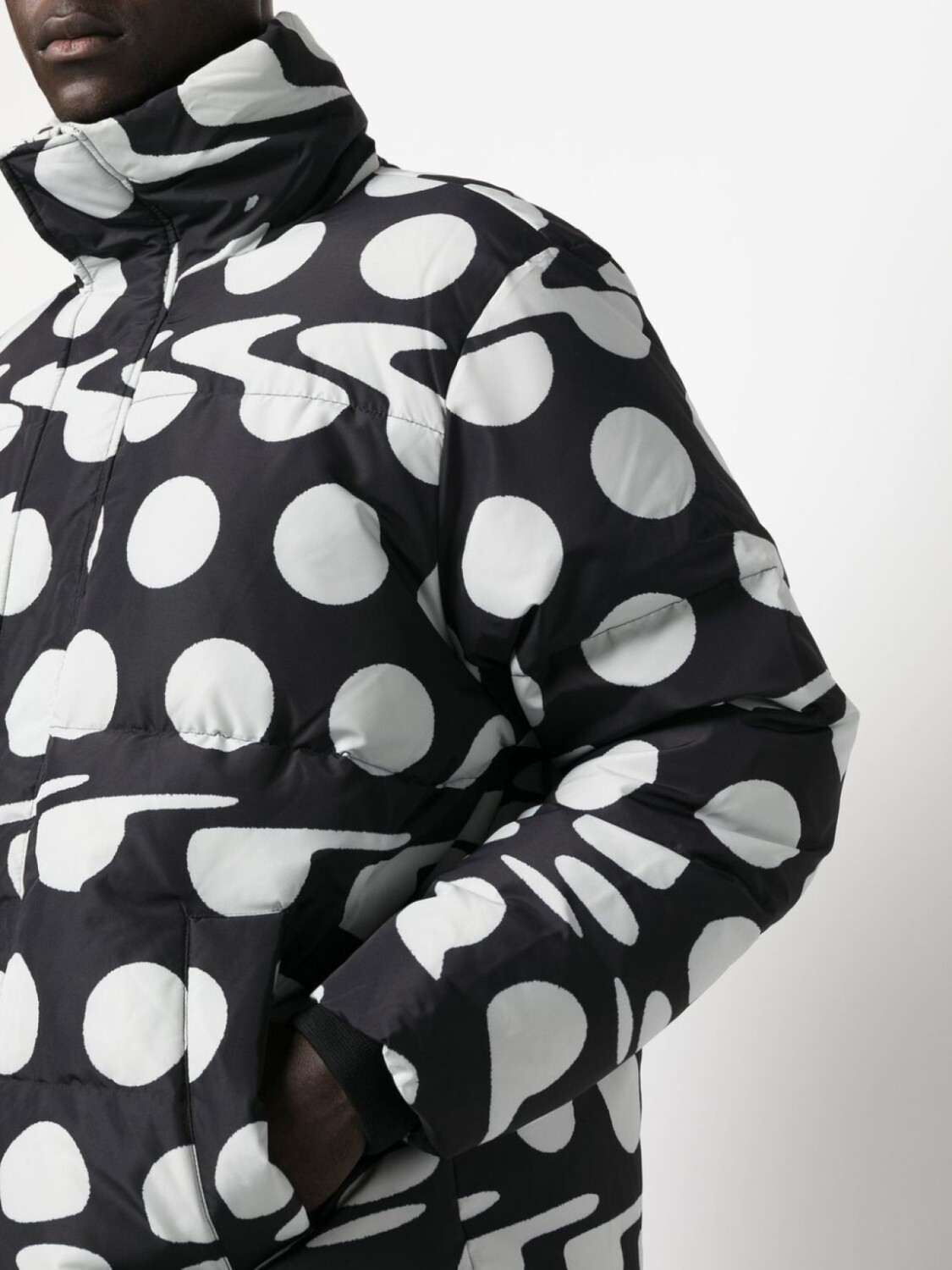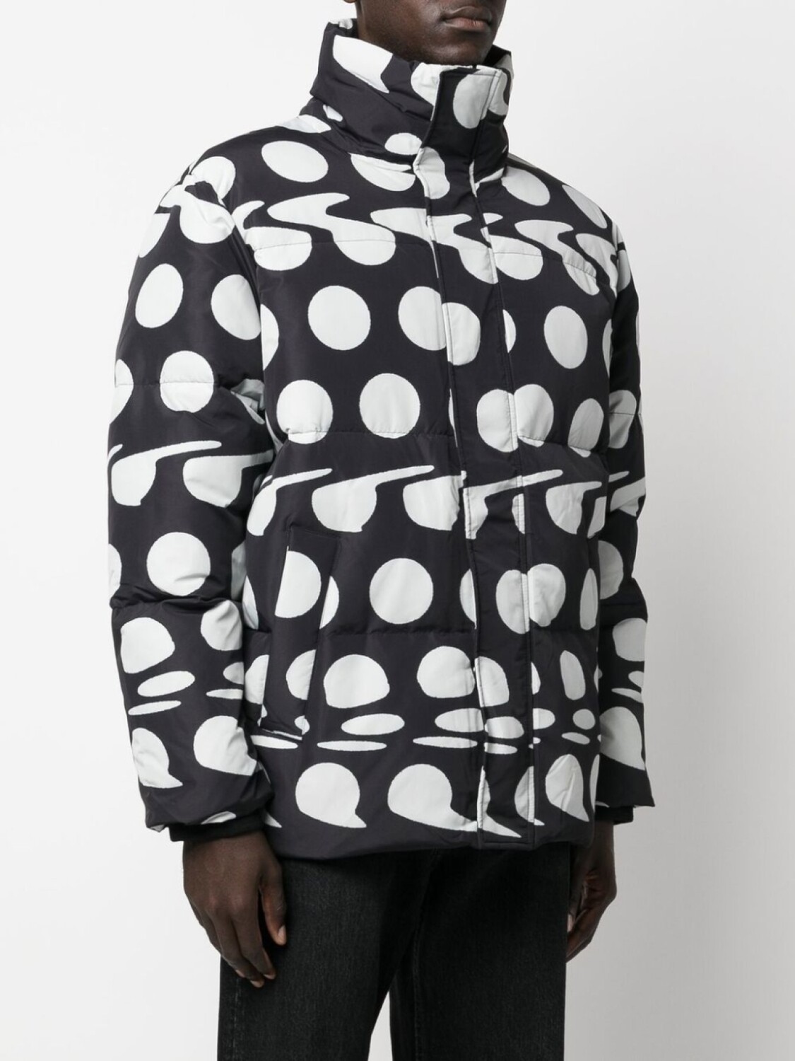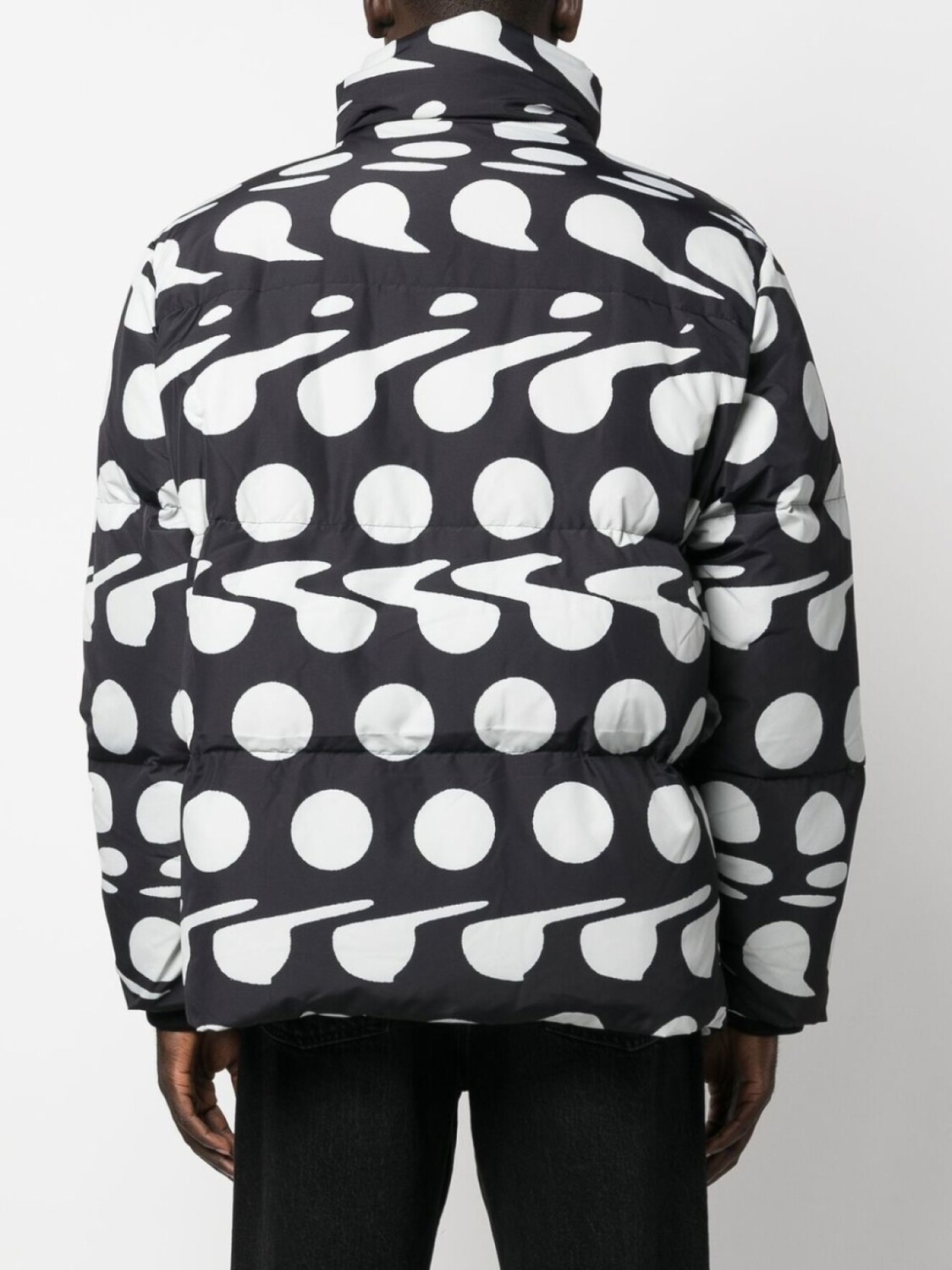 Черный/белый, наполнитель из смеси пуха и пера, дутый материал, сплошной графичный принт, высокий воротник, потайная молния спереди, два прорезных кармана сбоку, длинные рукава и прямой подол.