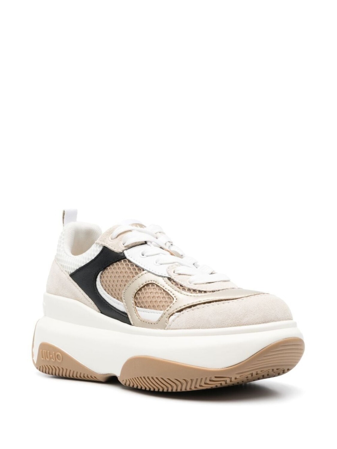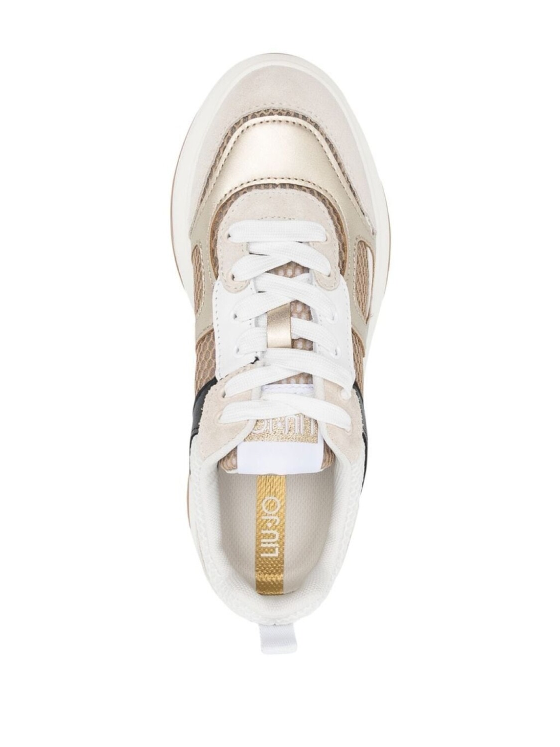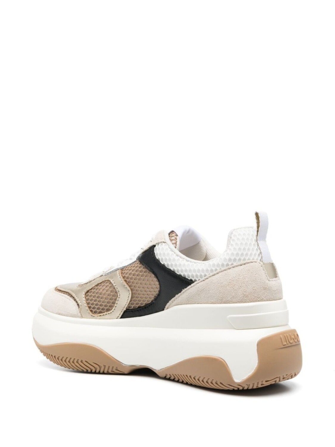Белый, песочно-коричневый, золотистый, телячья кожа, стиль колор-блок, нашивка с логотипом на язычке, подошва на платформе, шнуровка спереди, логотип на стельке и закругленный носок.