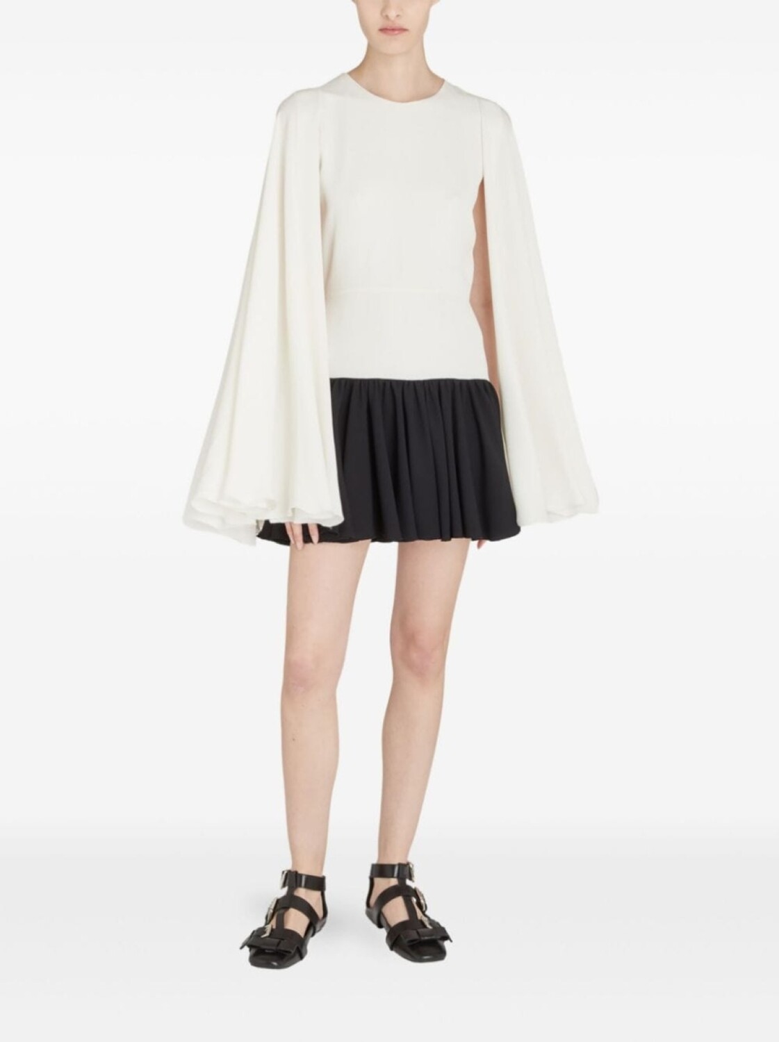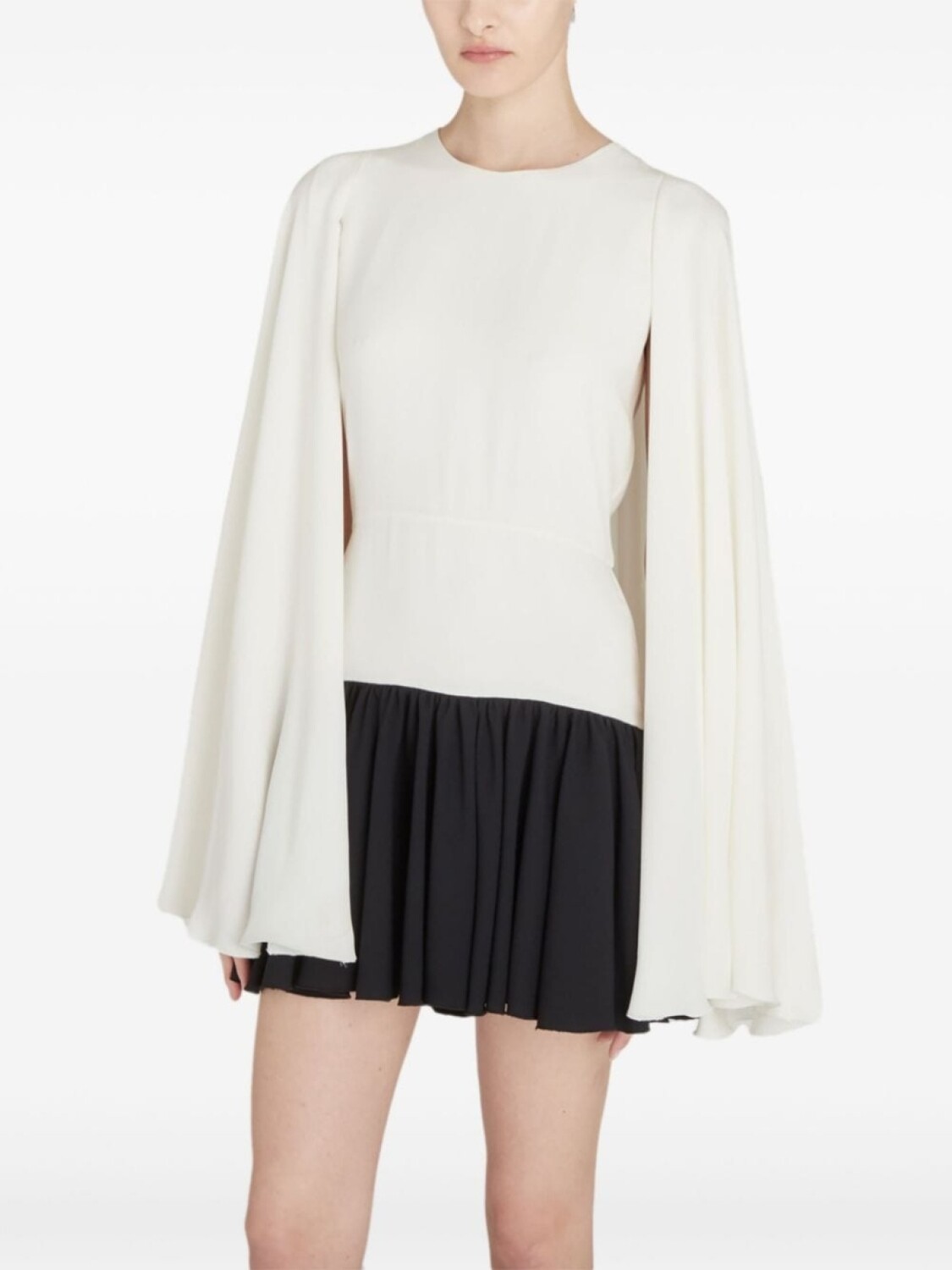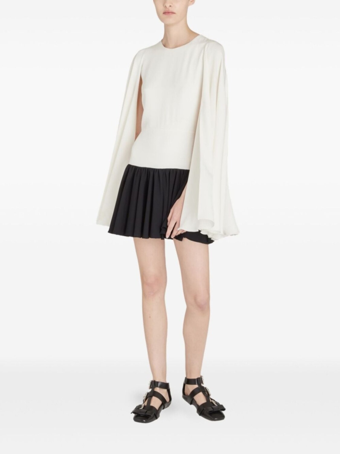 Белый/черный, креповая текстура, потайная застежка на молнии сзади, круглый вырез, кейп, расклешенная юбка, длина до бедер