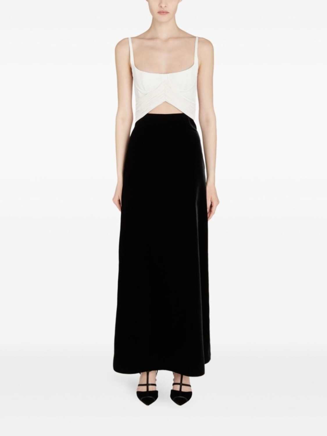Черный/белый, шелк, креповая текстура, бархат, сочетание двух оттенков, потайная застежка на молнии сзади, квадратный вырез, прорези на подошве, без рукавов, чашка на косточках, высота по щиколотку