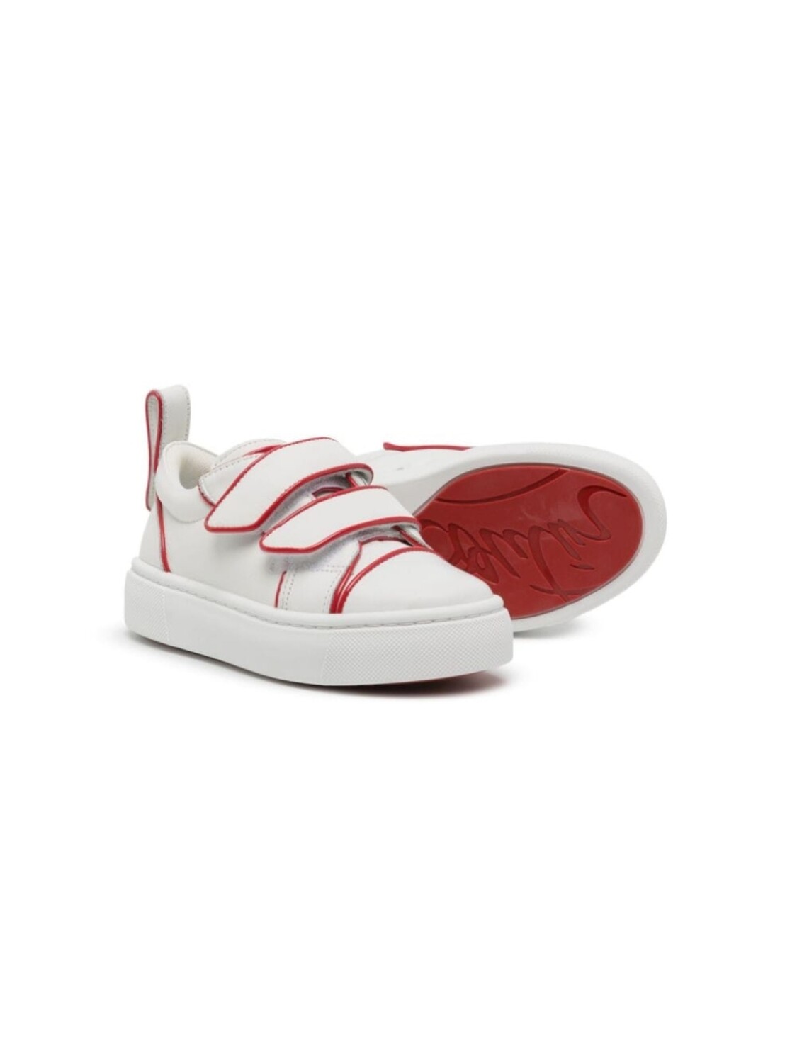 Белый, кроваво-красный, телячья кожа, застежка на липучке спереди, закругленный носок, петля для подтягивания сзади, тисненый логотип сзади, знаковая красная подошва, стелька с логотипом и плоская резиновая подошва.