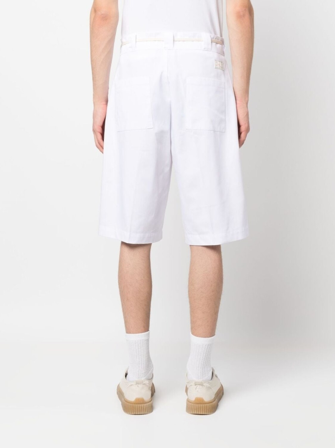 Белый, нашивка с логотипом сзади, потайная пуговичная застежка спереди, петли для ремня, два накладных кармана сзади и ремень на талии.