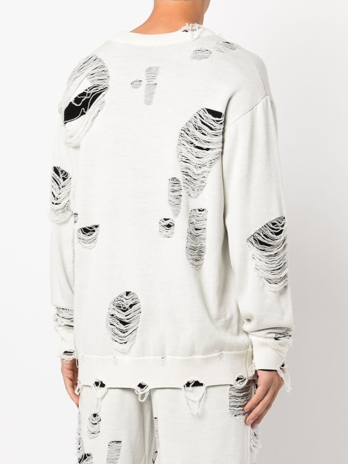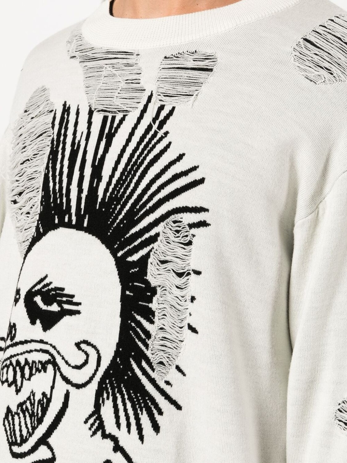 Белый, черный, шерсть, логотип в технике интарсия, искусственно состаренное покрытие, круглый вырез, длинные рукава, прямой подол и необработанные края.