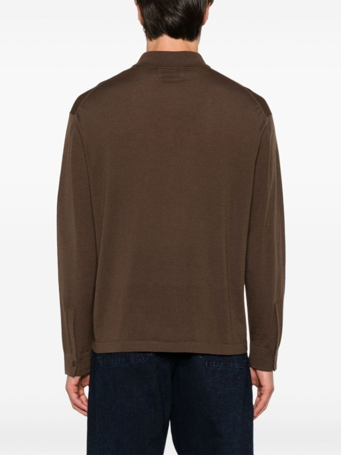Темно-коричневый, шерсть, тонкая вязка, застежка на пуговицах спереди, классический воротник, длинные рукава, подол и манжеты в рубчик, прямой подол