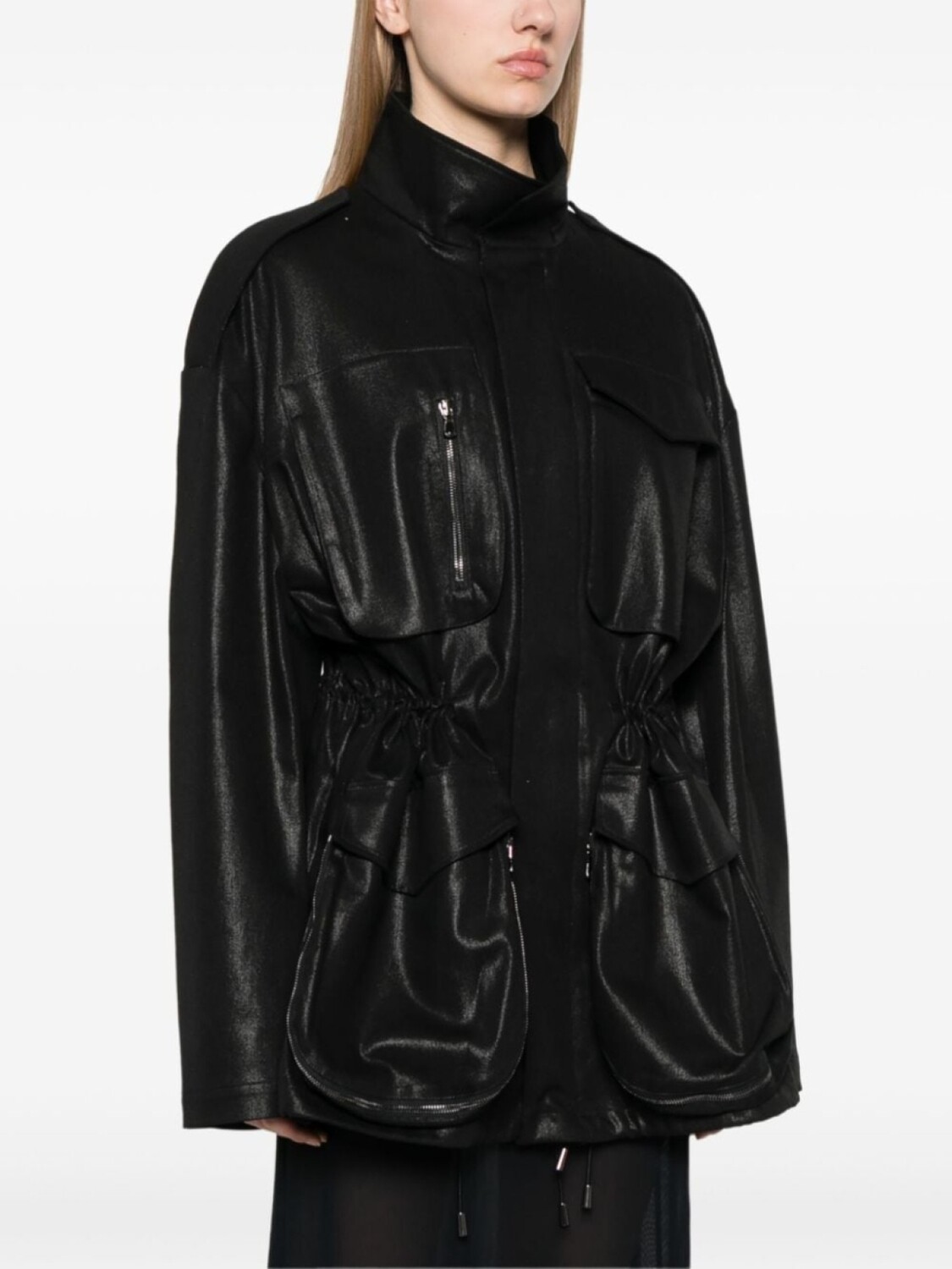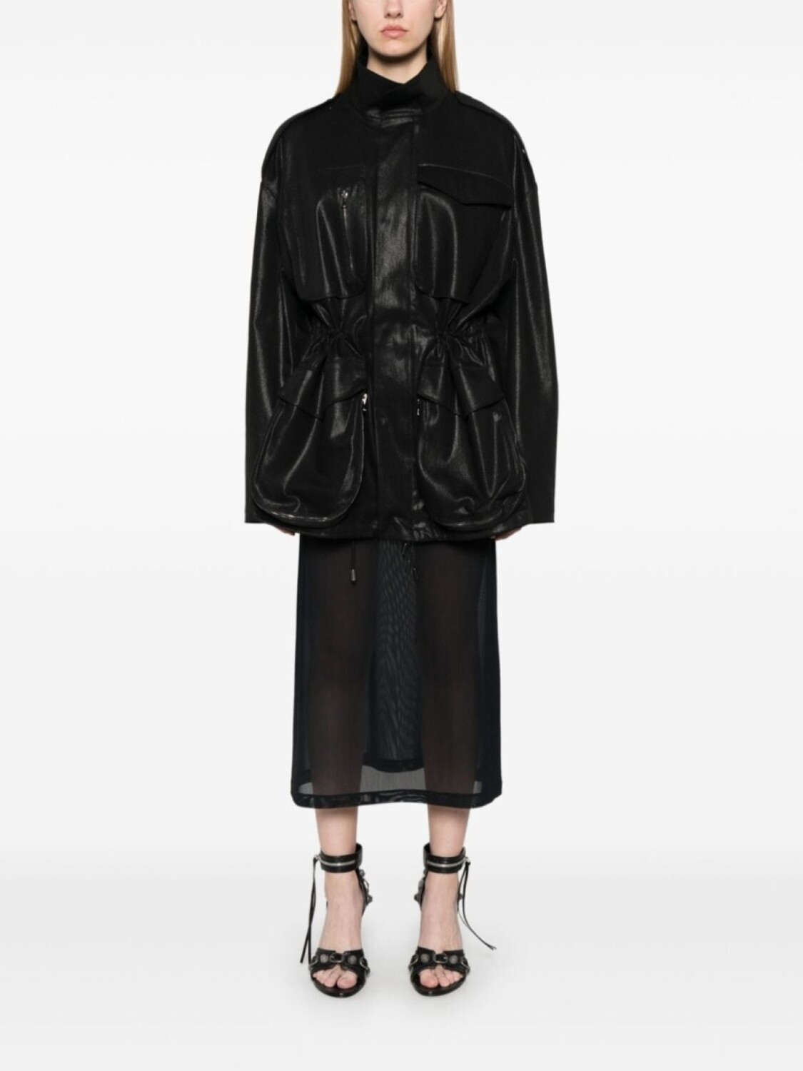 Черный, смесовый хлопок, ткань с твиловым переплетением, металл с покрытием, застежка на кнопки и молнию спереди, высокий воротник, нагрудный карман с клапаном, нагрудный карман на молнии, эполеты, длинные рукава, два накладных кармана спереди, два кармана на молнии по бокам, эластичный пояс на шнурке, цельная подкладка, прямой подол