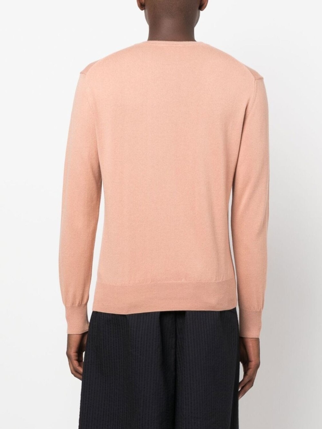 Смесь хлопка и кашемира, трикотаж в рубчик, вышитый логотип в форме державы, круглый вырез, длинные рукава и прямой подол.