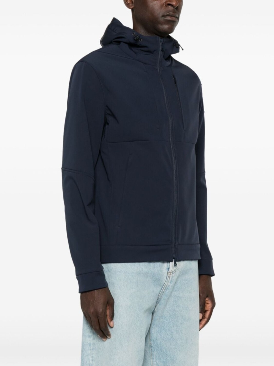 Темно-синий, плотный внешний материал, двойные стенки с изоляцией, нашивка с логотипом на рукаве, затягивающийся на шнурок капюшон, воротник-труба, двусторонняя молния спереди, длинные рукава, карманы на молнии спереди, прямой подол с кулиской, цельная подкладка