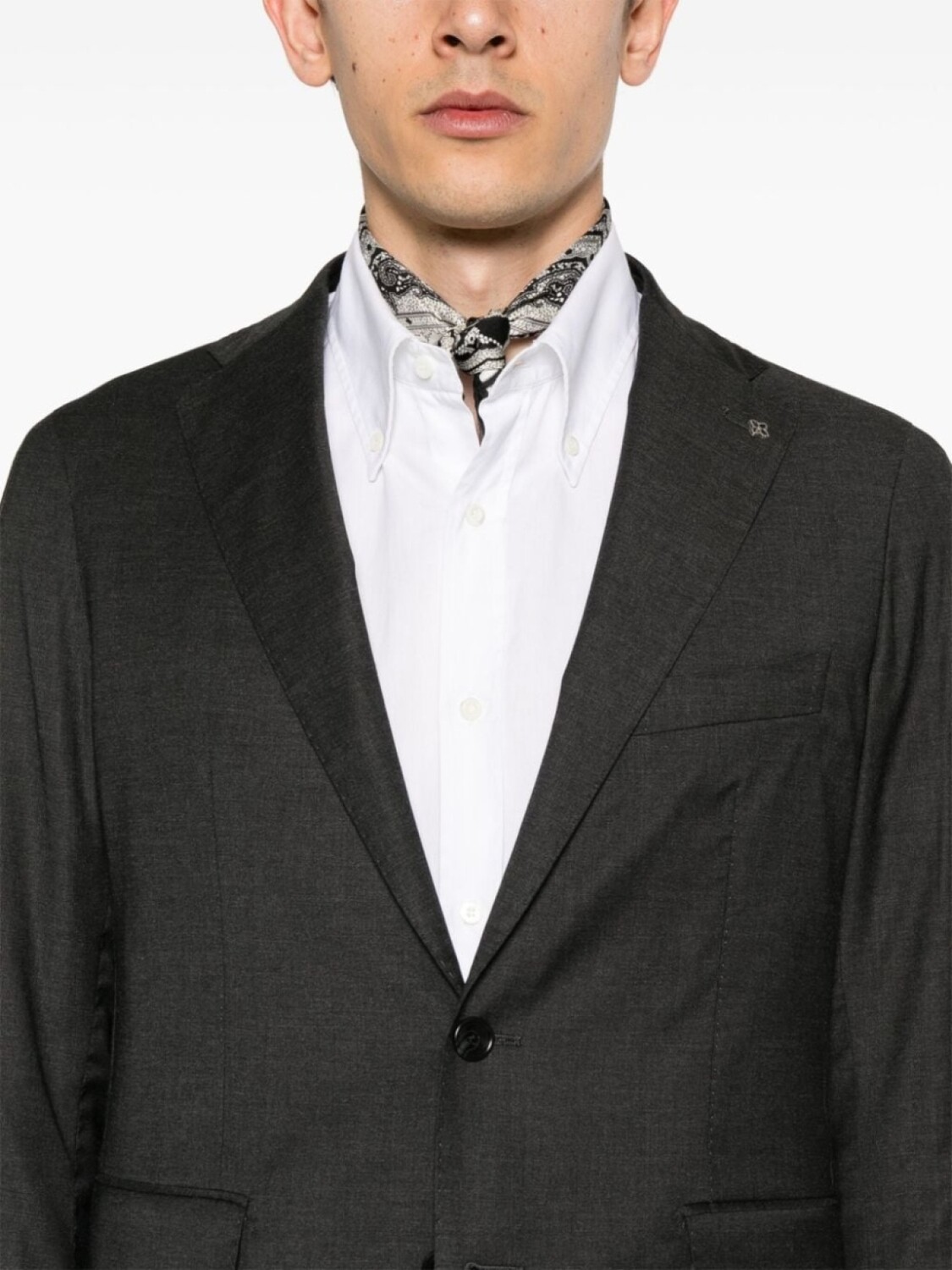 Подробнее о товаре: • антрацитово-серый • смесовая вирджинская шерсть • декоративная брошь • защипы • зазубренные лацканы • застежка на пуговицах спереди • длинные рукава • манжеты на пуговицах • прорезной карман на груди • два передних кармана с клапанами • две боковые шлицы сзади • прямой подол • стрелки • средняя посадка • потайная застежка на молнии и пуговицах • два прорезных кармана по бокам • два прорезных кармана на пуговицах сзади • строгий крой • зауженный крой