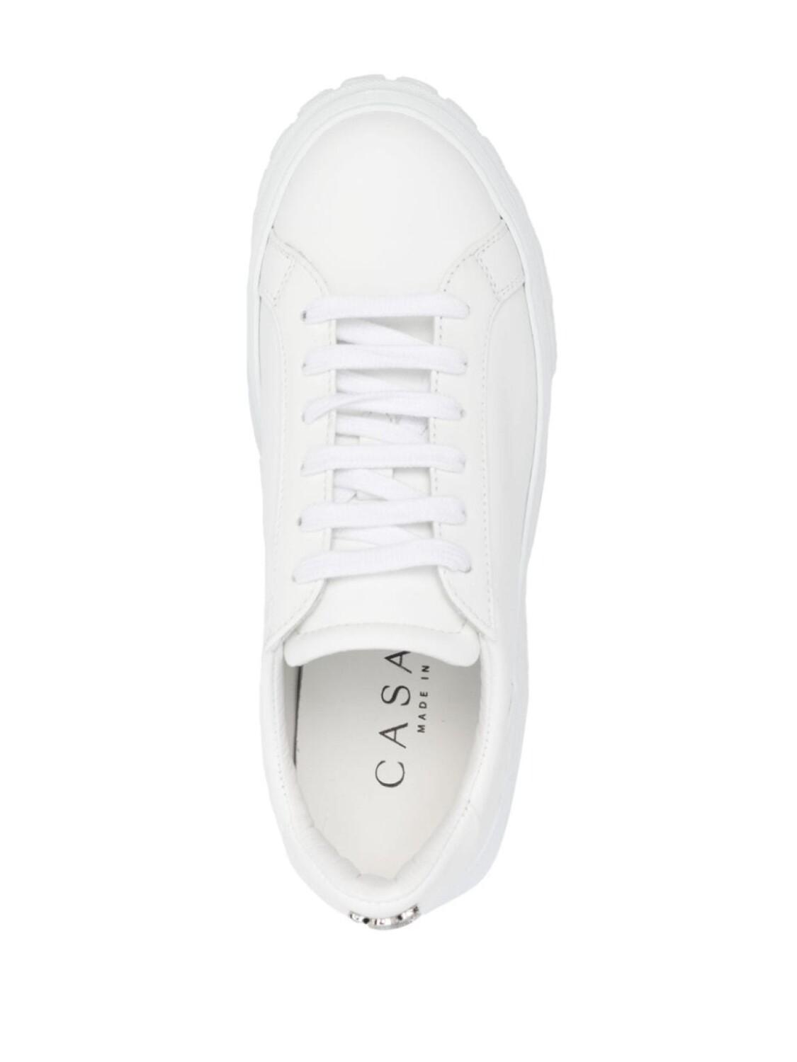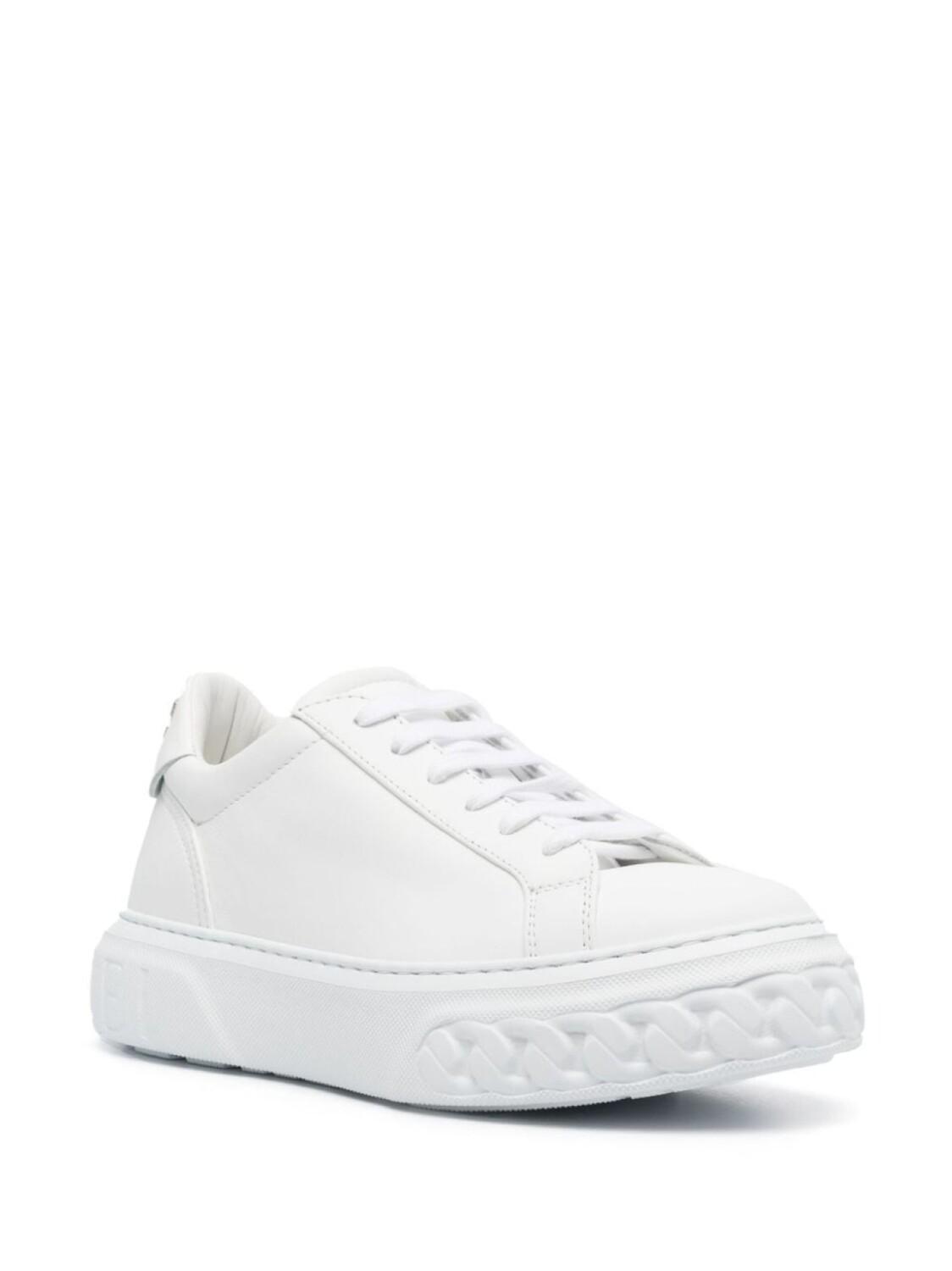 Белый, телячья кожа, однотонная расцветка, закругленный носок, шнуровка спереди, стелька с логотипом, задник с логотипом и плоская резиновая подошва.