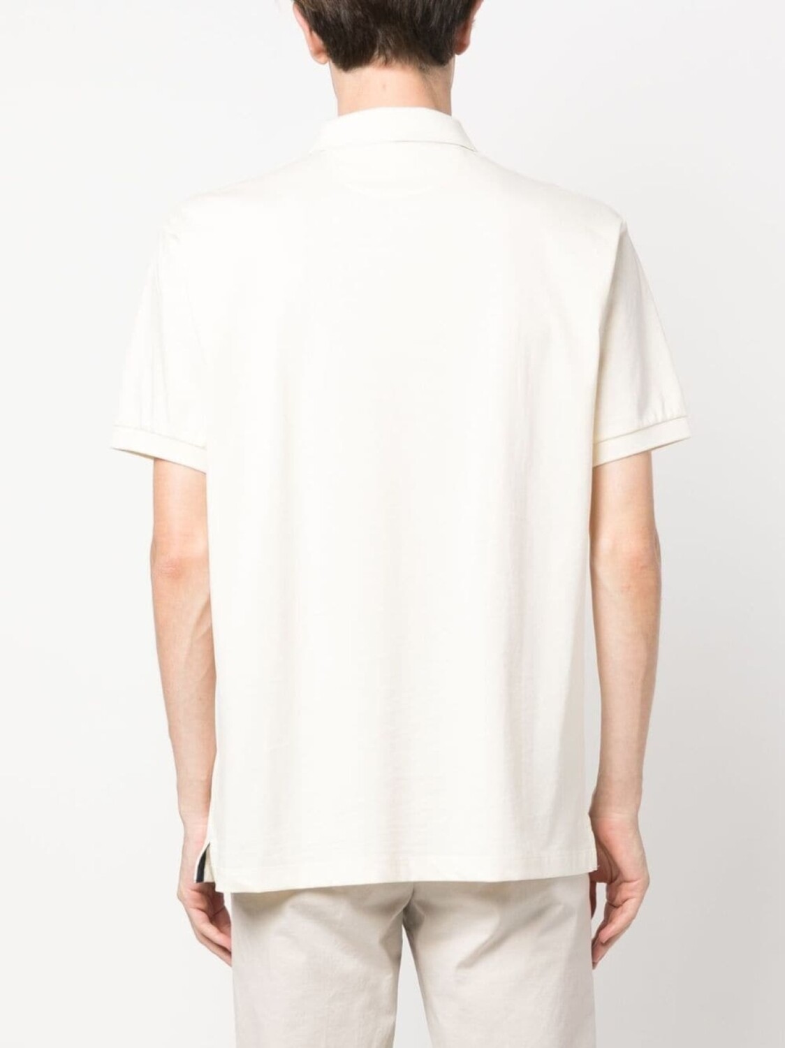 Экрю, хлопок, вышитый логотип на груди, воротник поло, короткая застежка на пуговицах спереди, короткие рукава и прямой подол.