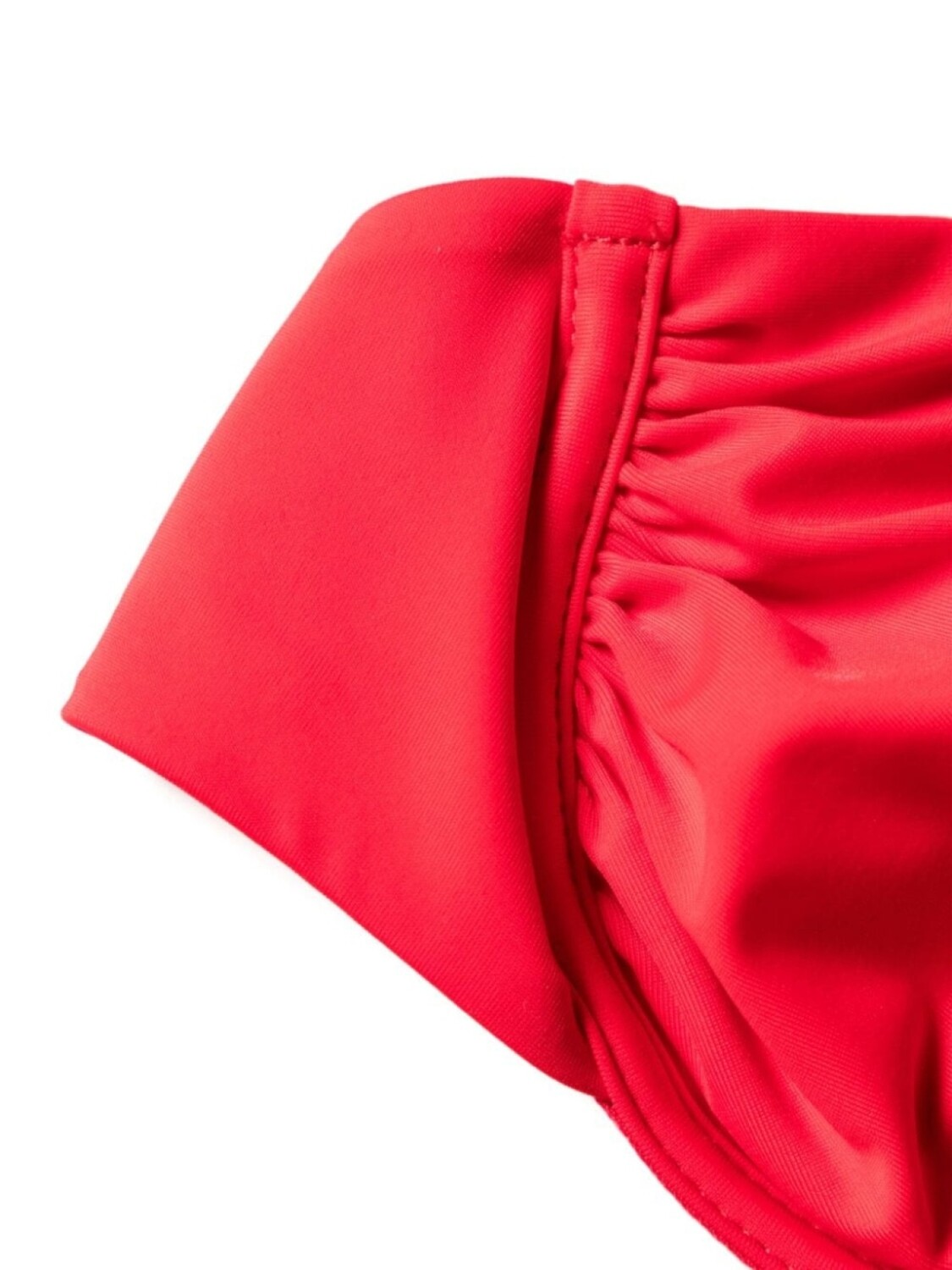 Красный, эластичный материал, широкий вырез, балконет, цельная косточка, детали с оборками, регулируемые тонкие бретели, застежка на зажиме сзади, плавки бикини с завязками по бокам, модель из двух частей, Пожалуйста, примеряйте купальники и пляжные шорты только поверх собственного белья.