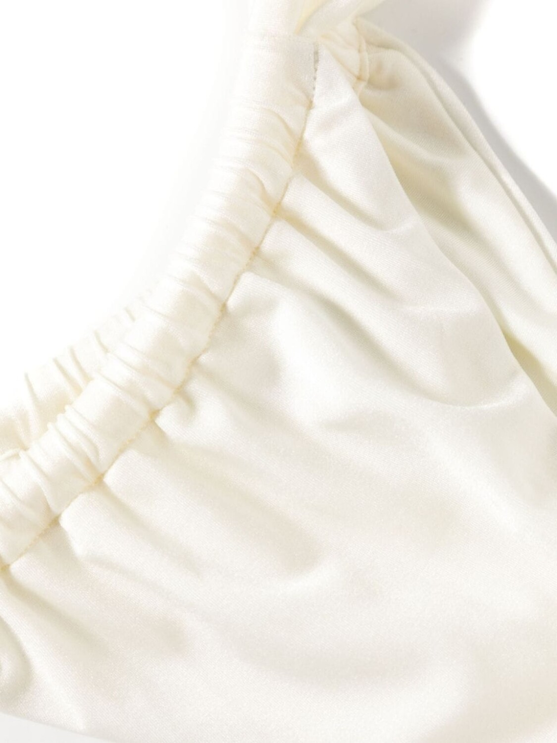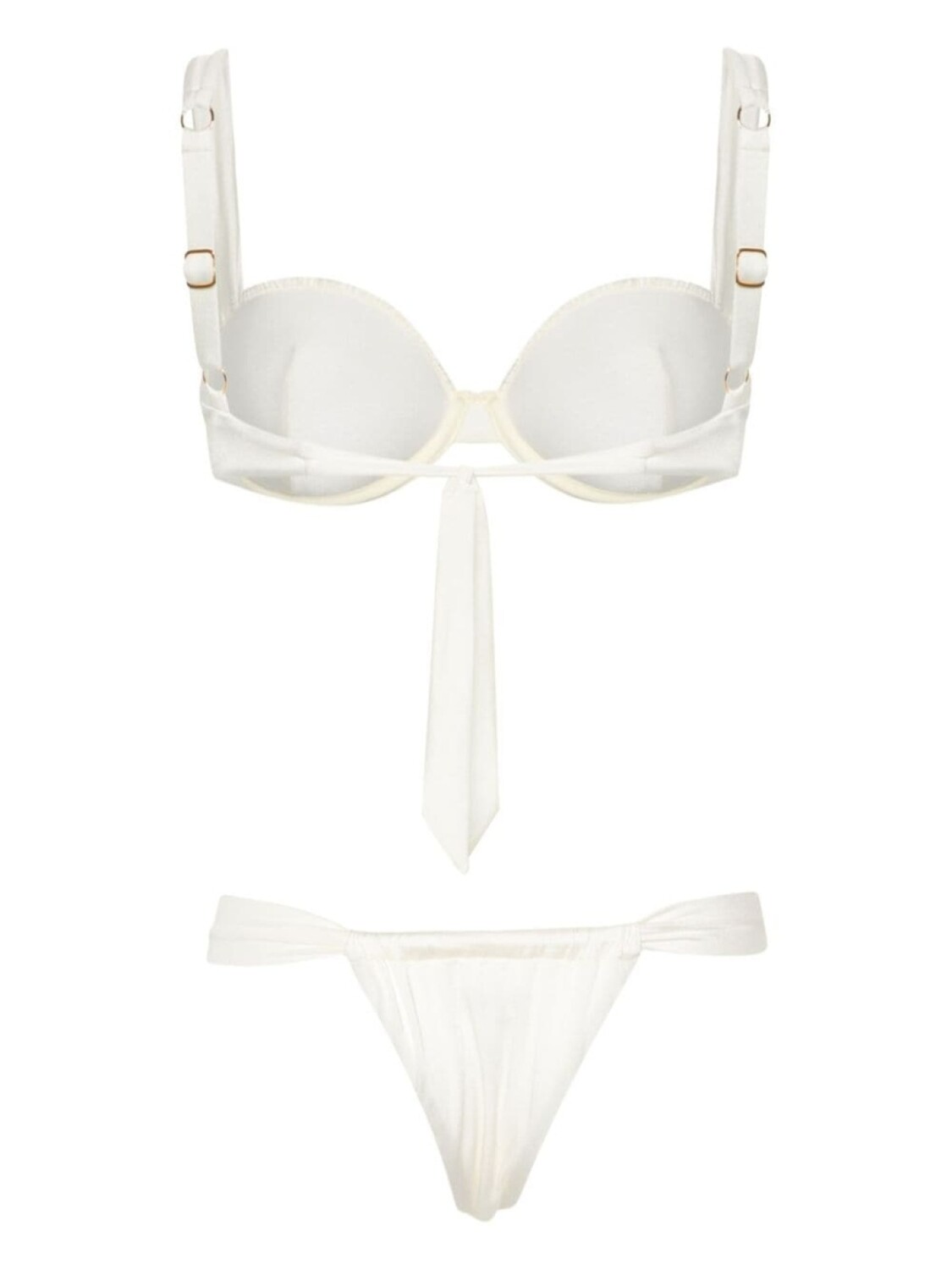 Подробнее о товаре: • оттенок слоновой кости • эластичный материал • атласная отделка • детали с оборками • декольте-балконет • встроенные чашки и бюстгальтер на косточках • застежка на завязке сзади • регулируемые лямки • квадратный вырез на спине • цельная подкладка • детали с оборками • трусы-бразилиана • завышенная талия • эластичный пояс • высокий вырез • цельная подкладка • набор из двух предметов • Пожалуйста, примеряйте купальники и пляжные шорты только поверх собственного белья.