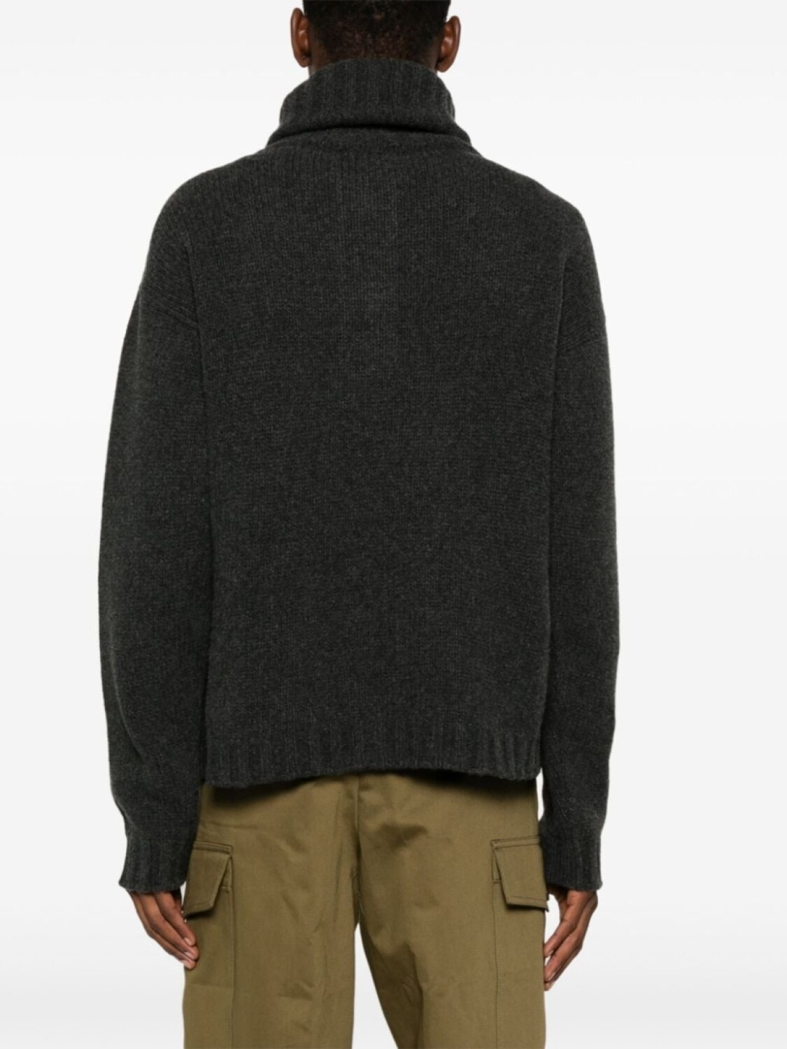Антрацитово-серый, смесь шерсти и кашемира, трикотажная конструкция, застежка-поворот, планка, воротник-стойка, длинные рукава, ребристые манжеты и низ, короткие боковые разрезы, прямой подол