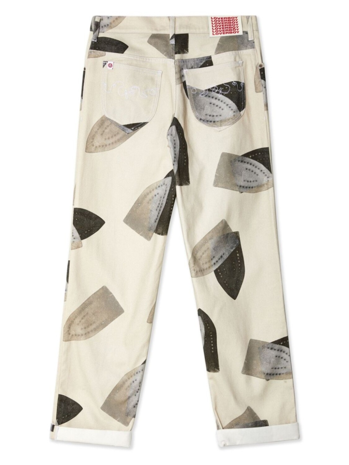 Кремово-белый, хлопок, деним, принт с узором, средняя посадка, прямой крой, нашивка с логотипом сзади, петли для ремня, ширинка на пуговицах и пять карманов.