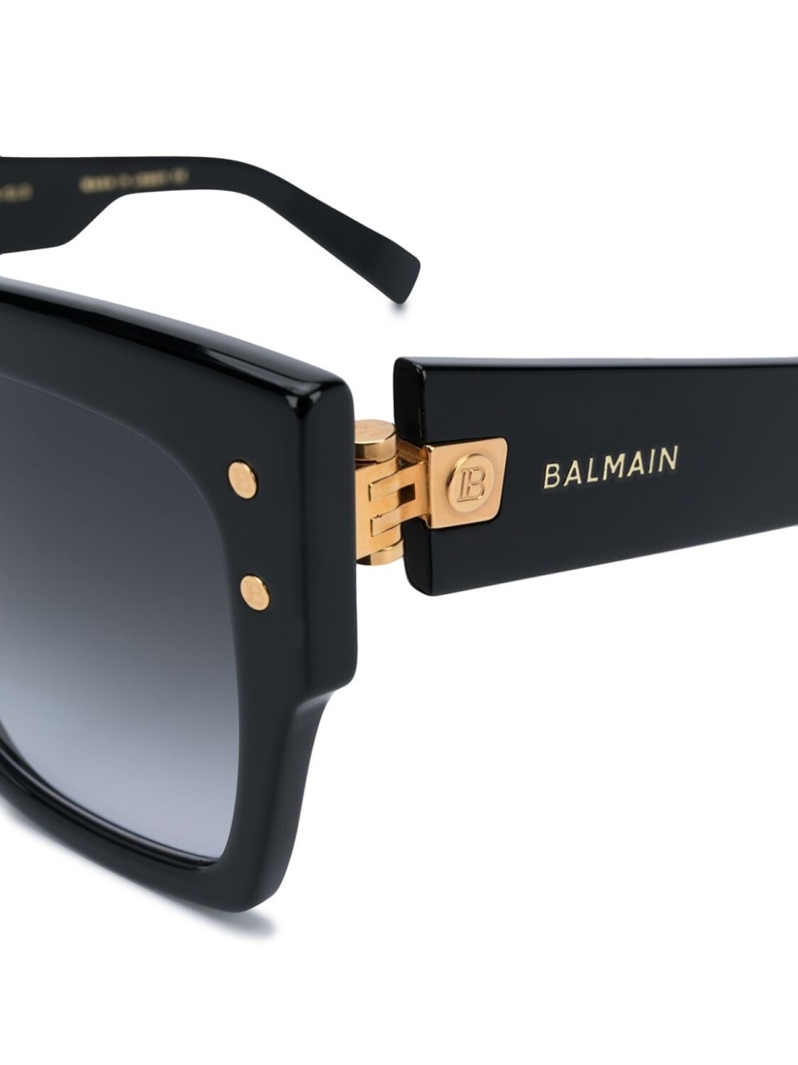 Солнцезащитные очки B-II в квадратной оправе от Balmain (Бальман). Квадратная оправа, серые линзы, золотистая фурнитура и тисненый логотип сбоку. Цвет: черный. Прилагается защитный чехол.