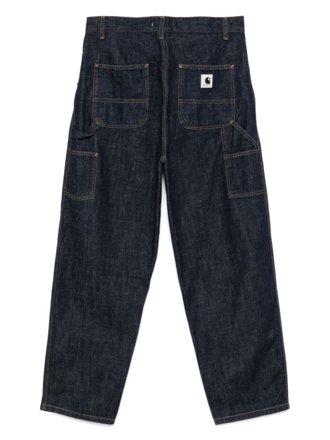 Индигово-синяя хлопковая джинсовая ткань, застежка на молнию и пуговицы спереди, шлевки для ремня, два диагональных кармана по бокам, два накладных кармана сзади, нашивка с логотипом сзади, прямая штанина