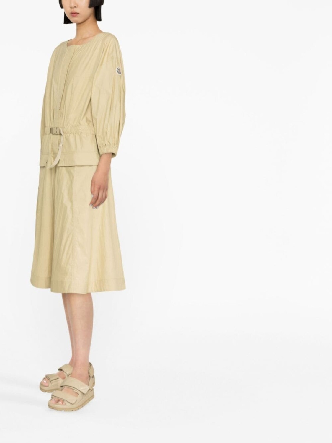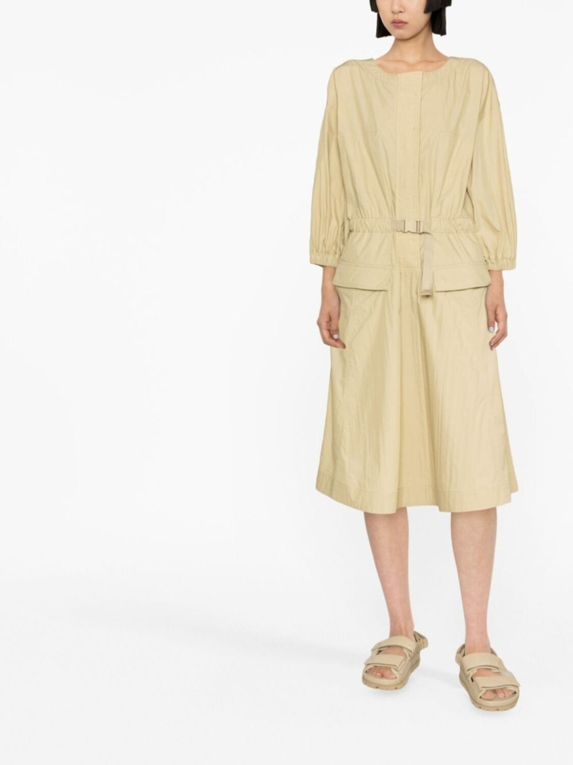 Бежевый, смесовый хлопок, круглый вырез, рукава три четверти, потайная застежка спереди, ремень на талии, два передних кармана с клапанами, расклешенная юбка и длина до середины икры.