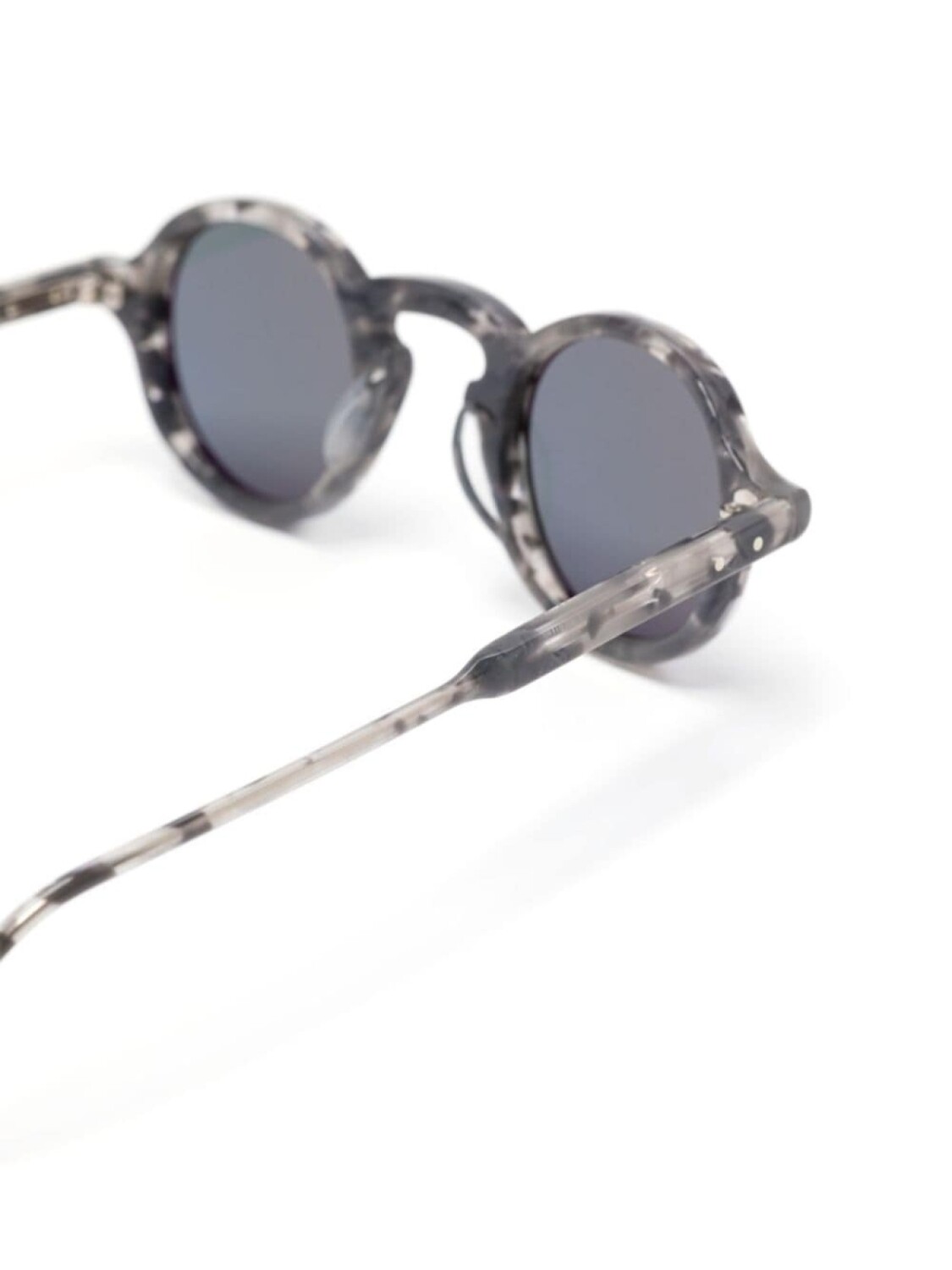 Круглая оправа светло-серого черепахового цвета, серые тонированные линзы, фигурные дужки, изогнутые кончики. Очки поставляются с защитным футляром.