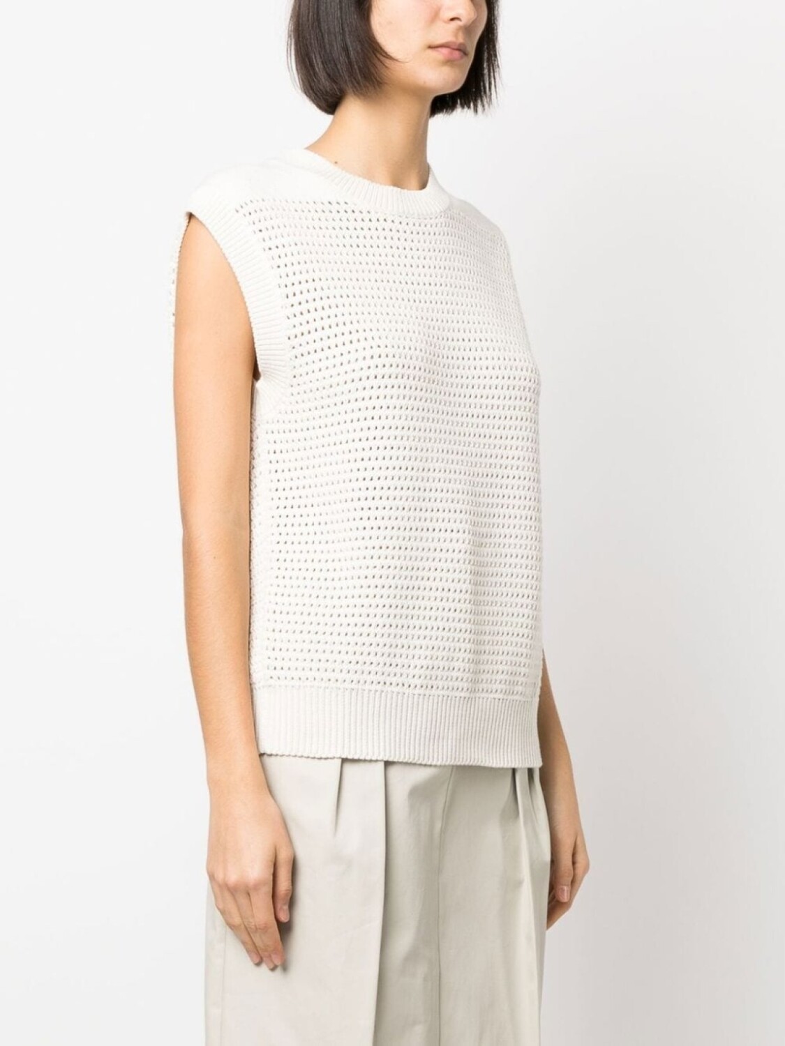 Экрю, трикотажный материал, вязка с узором «соты», круглый вырез, без рукавов и прямой подол.