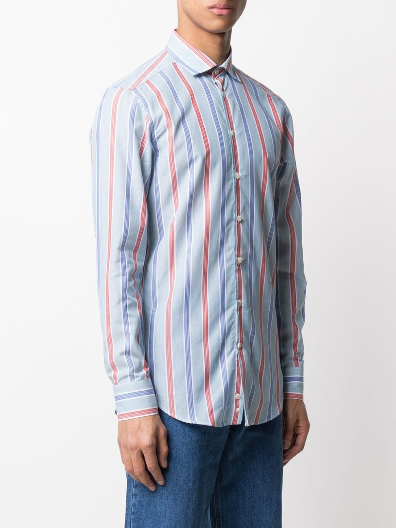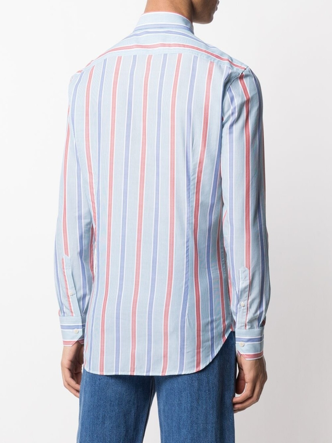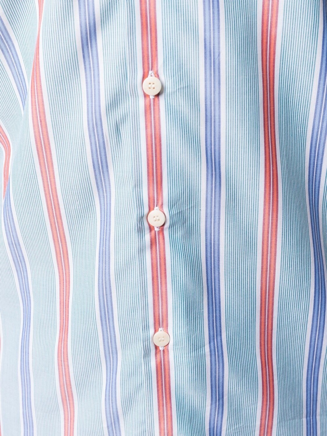 Полосатая рубашка с косым воротником от Etro (Этро). Свободный крой, застежка на пуговицах спереди, длинные рукава, манжеты на пуговицах и закругленный подол. Цвет: разноцветный.