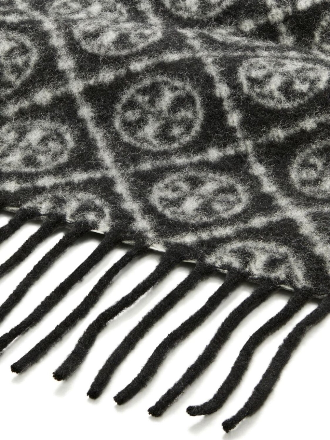 Черно-белая смесь шерсти и кашемира, трикотажная конструкция, отделка щеткой, узор с монограммой, бахрома по краю, стиль обертывания