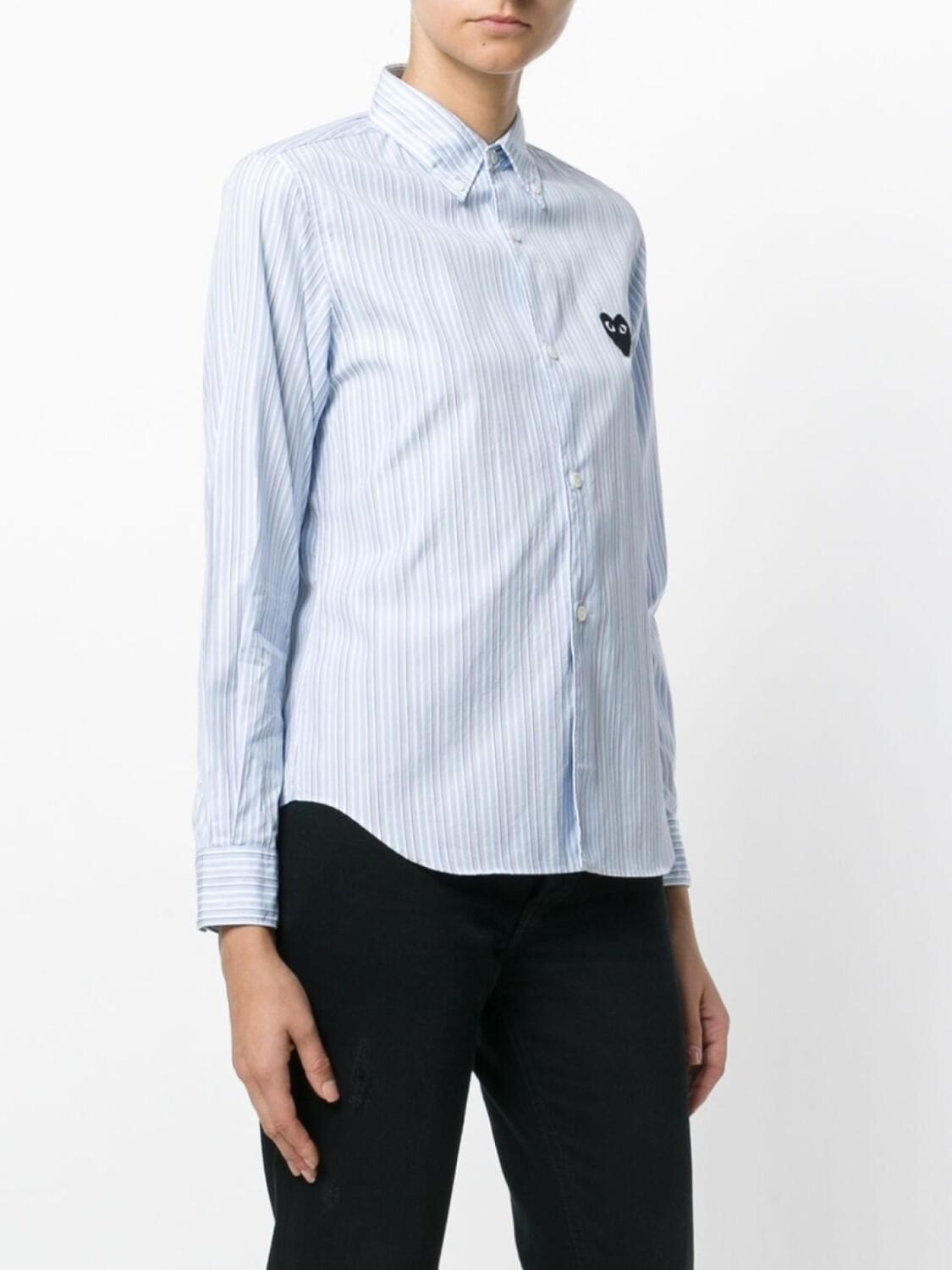 Полосатая рубашка с нашивкой в форме сердца от Comme des Garçons Play. Воротник на пуговицах, вертикальные полоски, застежка на пуговицах спереди, длинные рукава, манжеты на пуговицах и закругленный подол. Цвет: синий.