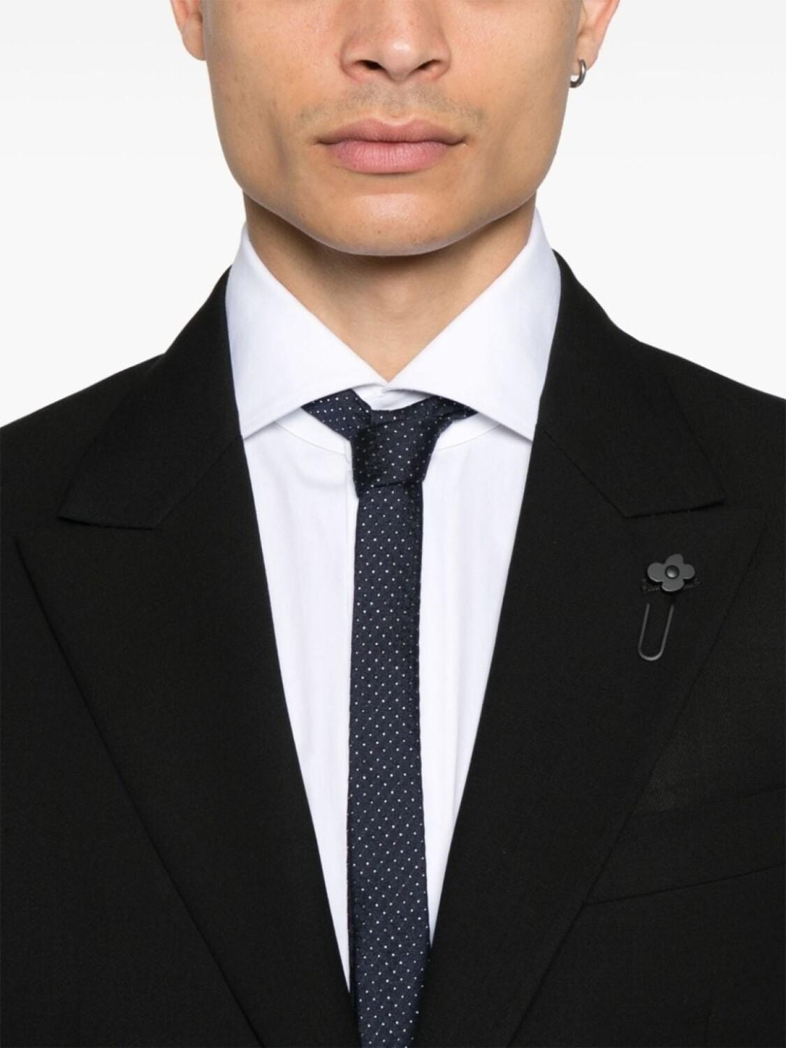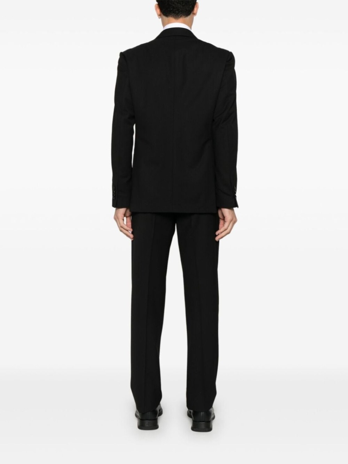 Черный, смесовая вирджинская шерсть, застежка на пуговицах спереди, заостренные лацканы, брошь-логотип, длинные рукава, манжеты на пуговицах, прорезной карман на груди, защипы, два прорезных кармана по бокам, две боковые шлицы сзади, внутренние прорезные карманы, цельная подкладка, потайная застежка на пуговицы, крючок и молнию спереди, петли для ремня, два прорезных кармана по бокам, складки, стрелки, два прорезных кармана на пуговицах сзади, длина в пол